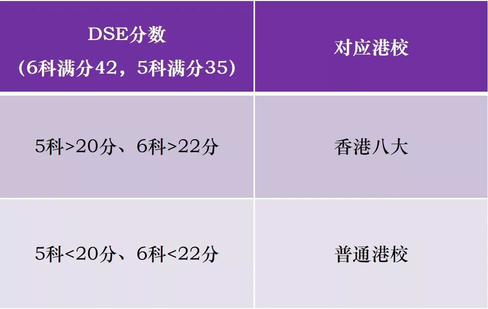 DSE考试考生需考5-6个科目,单科科目满分7分,想要考取港八大,至少满足5科>20分,6科>22分的要求。