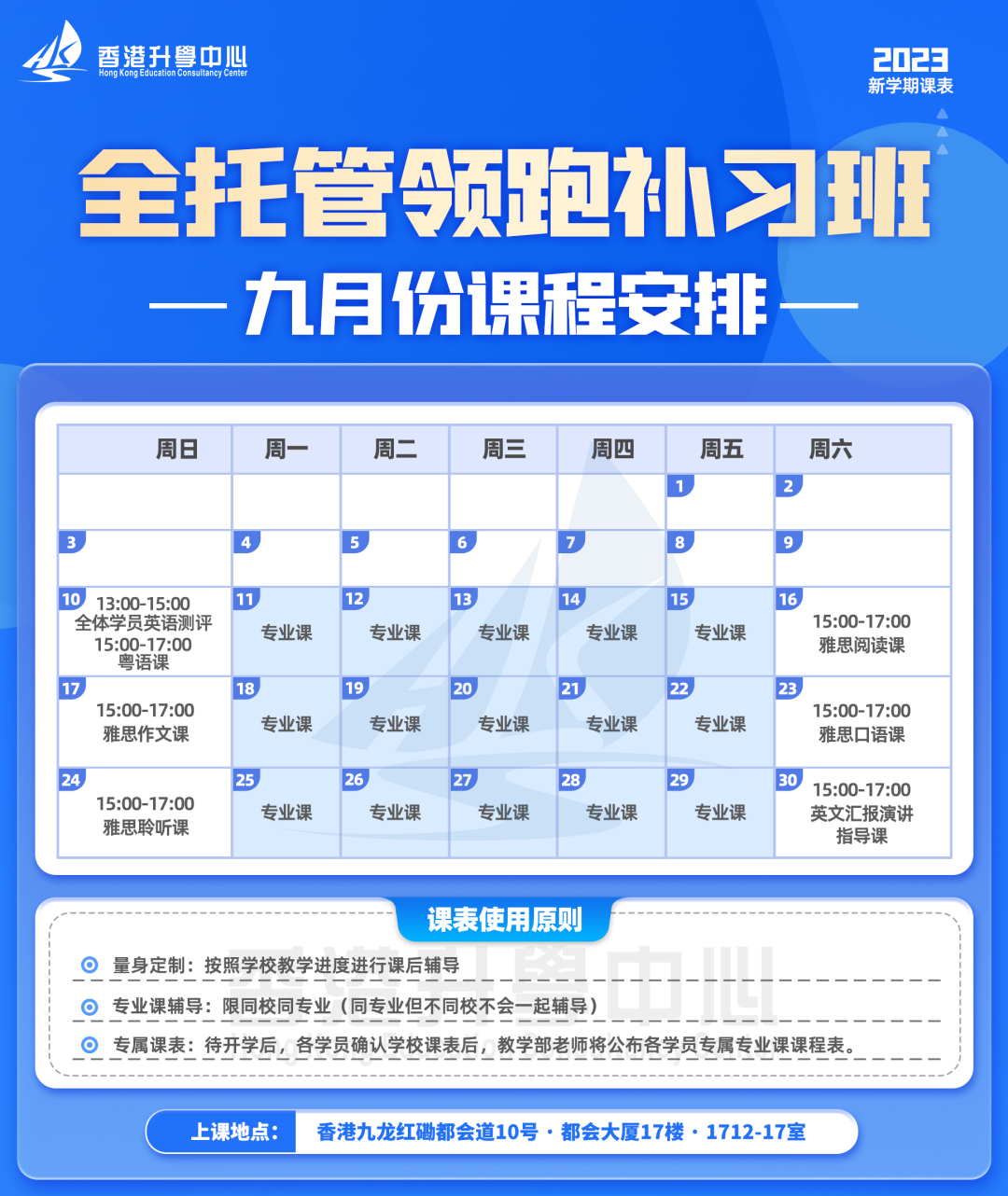 9月份的课程范围涵盖了雅思专项训练、英文全面提升、专业课程辅导,粤语补习四大版块,帮助学员从“语言成绩+专业课程”两方面全方位过渡到港校的学习模式。