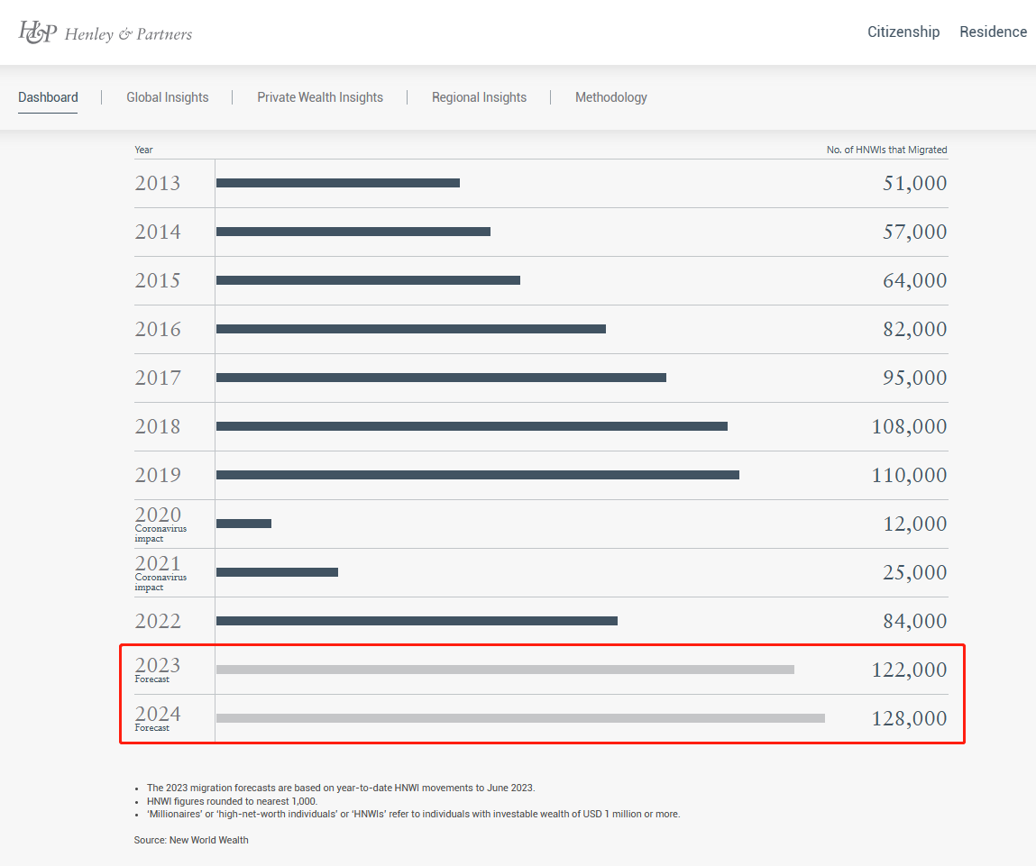 从报告中得知,2023年预计全球将有12.2万位高净值人士移民,远远超过了2019年的11万人;而2024年,预计会增长到12.8万名。