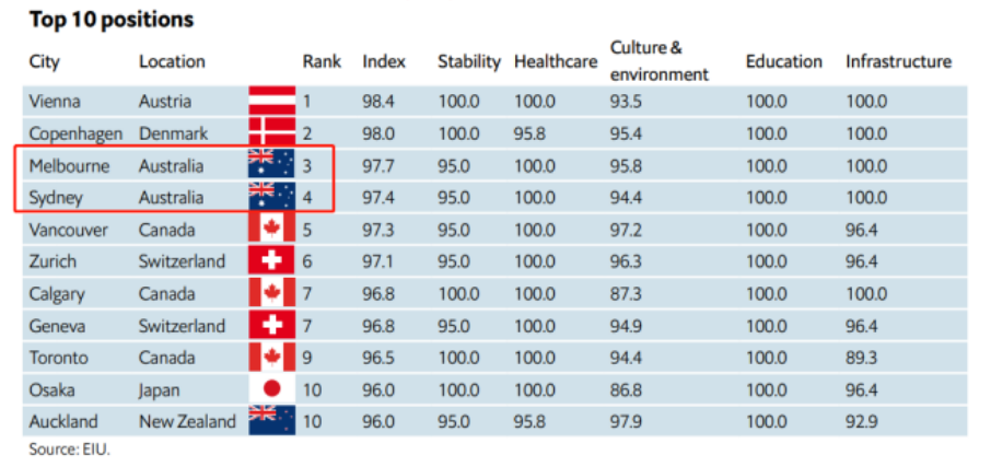 根据世界领先商业分析机构经济学人智库(EIU)发布的《2023全球宜居城市》排名,墨尔本与悉尼跃升至榜单前5名,分别位列世界第3、第4。