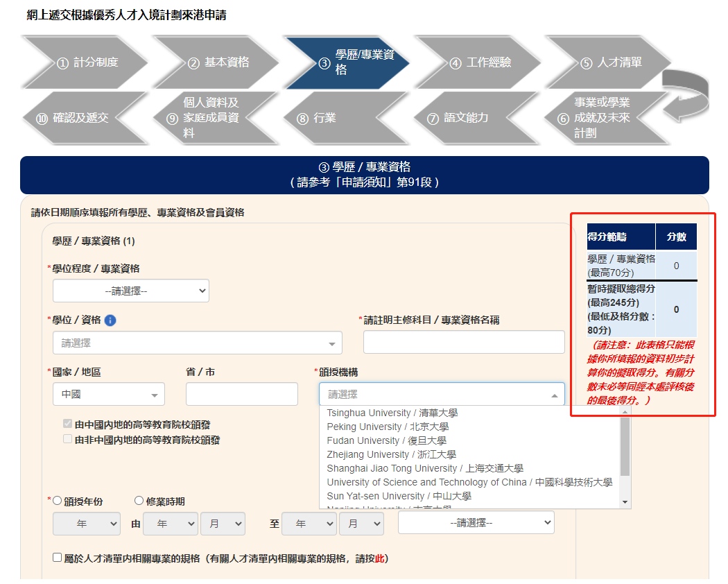 以学历/专业资格为例,申请人只需要填上对应学位与学校,系统将会自动计分。