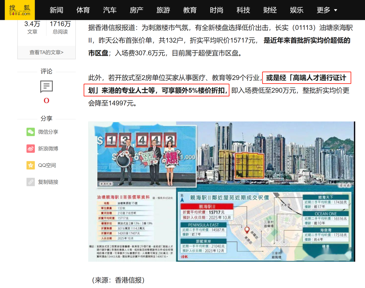 8月3日,李嘉诚旗下的长实集团首开先例,宣布经“高才计划”赴港的专业人士,在长实集团新楼盘买房可额外享受5%的楼价折扣。