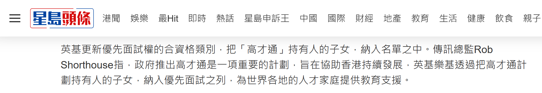 而英基传讯总监Rob Shorthouse指出,“高才计划”作为港府一项重要的计划旨在协助香港持续发展,所以学校愿意把此计划持证人的子女,纳入优先面试之列,为世界各地的人才家庭提供教育支援。