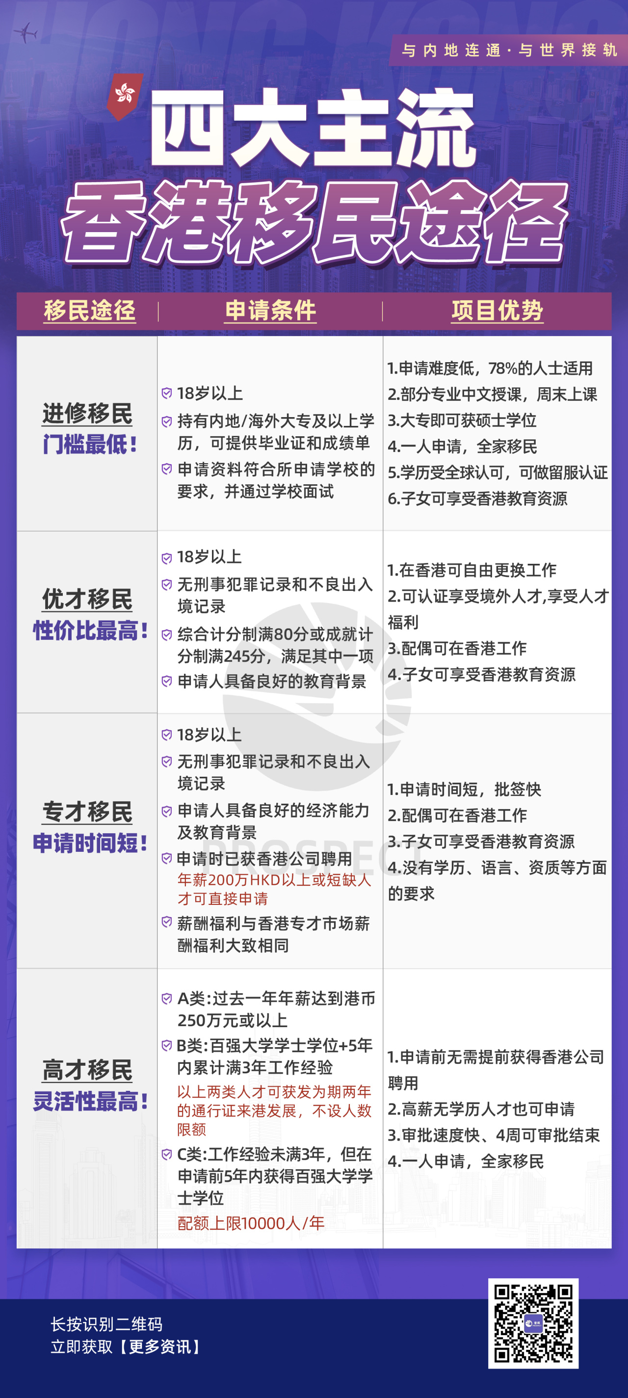 所以,要是想让孩子通过这条路径升学名校,可以通过“优才计划”、“专才计划”、“高才计划”,以及“留学进修”等方式,获得一个香港身份。