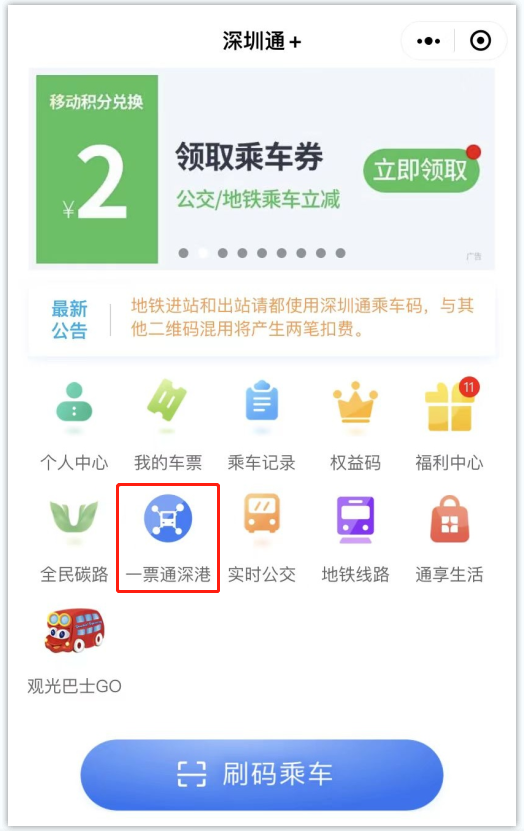 除了【深港一码通】外,还推出了【深港一票通】服务,此服务可通过深圳通app或小程序选择“一票通深港”功能,购买跨境巴士车票,实现公交+地铁+跨境巴士的一票通行体验。