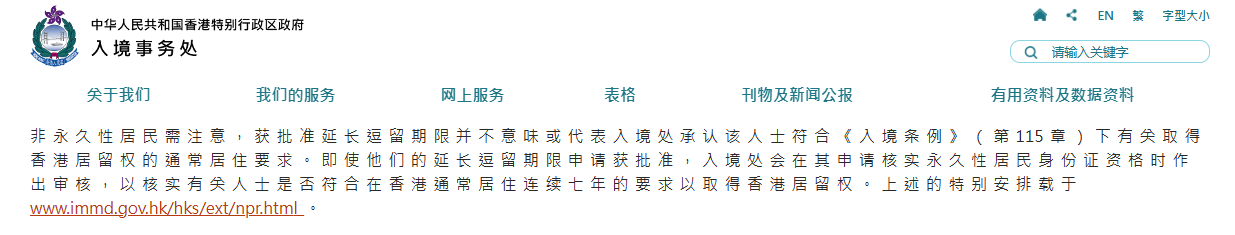 但还未成为永久居民的人士需要注意,获批准延长逗留期限并不意味或代表入境处承认该人士符合《入境条例》(第115章)下有关取得香港居留权的通常居住要求。