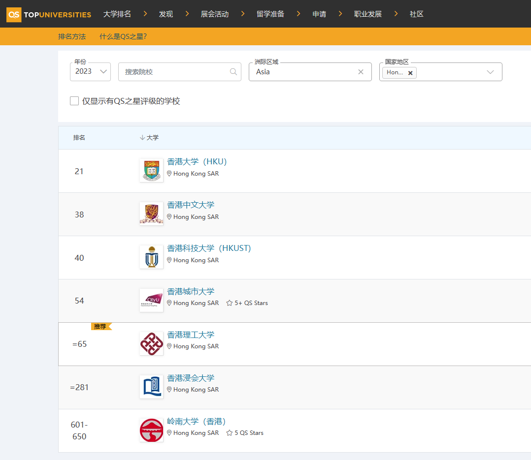 此次排名中,香港共有5所大学上榜。分别是香港大学、香港中文大学、香港科技大学、香港理工大学,以及香港城市大学。