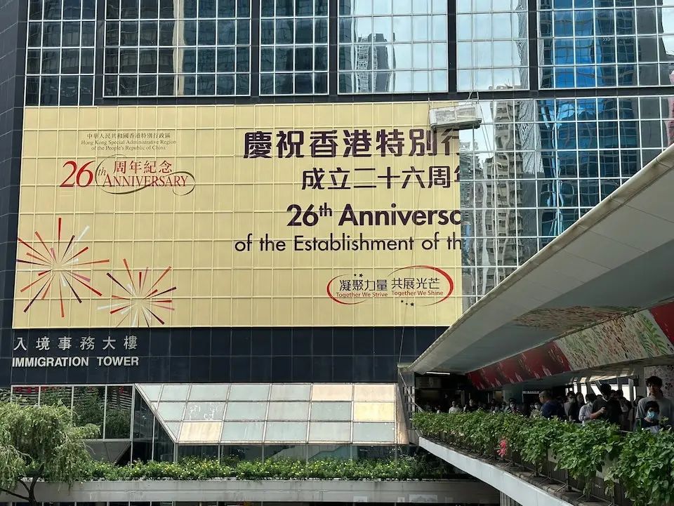 临近7月1日,香港街头开始“装扮”起来,香港湾仔的入境处大楼外,已经挂起了纪念横幅。