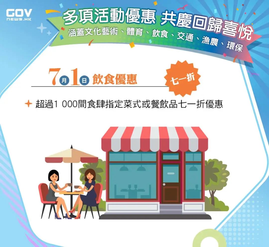 7月1日,饮食业界将有超过1000间店铺推出指定菜式、餐饮品享七一折优惠。部分店铺则会赠送现金券(现金券金额视餐厅类型而定)