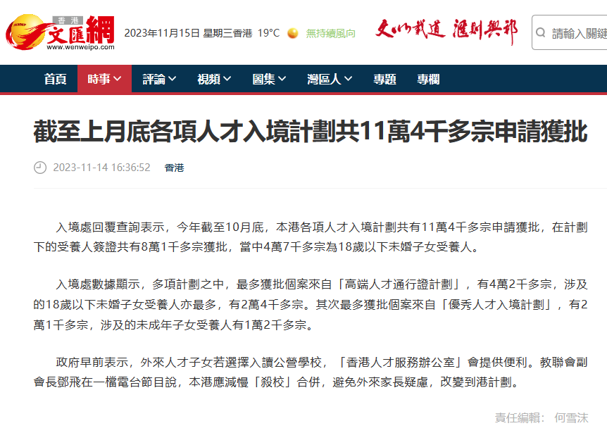 根据香港文汇网报道,截至10月底,香港各项人才入境计划共收到18.4万宗申请,当中已有约11.4万宗申请获批。