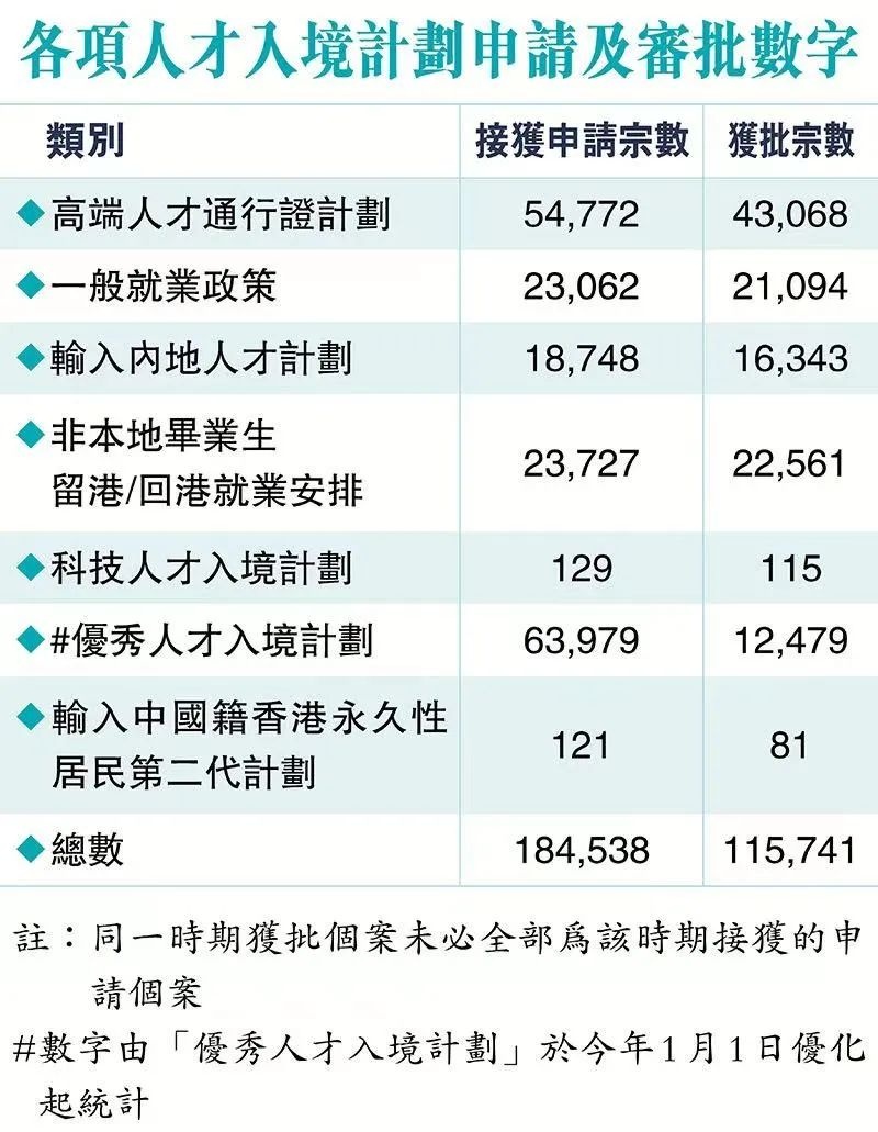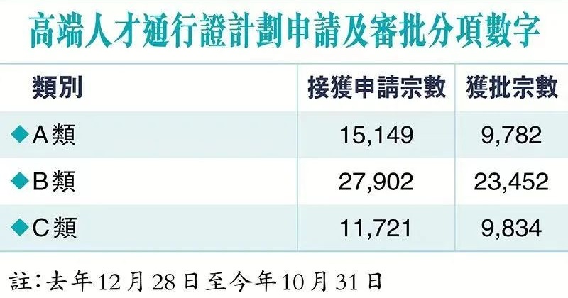 “高才计划”获批43,068宗,18岁以下未婚子女约有2.4万宗;“优才计划”获批12,479宗,18岁以下未婚子女约有1.2万宗。