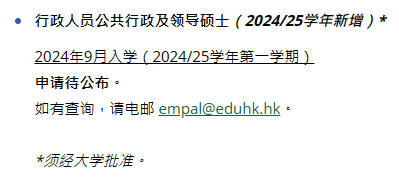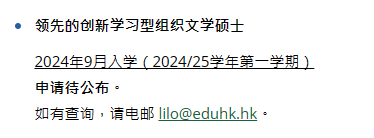 其中,行政人员公共行政及领导硕士、领先的创新学习型组织文学硕士两个课程的申请时间待公布,教育学硕士将在11月下旬开始申请。