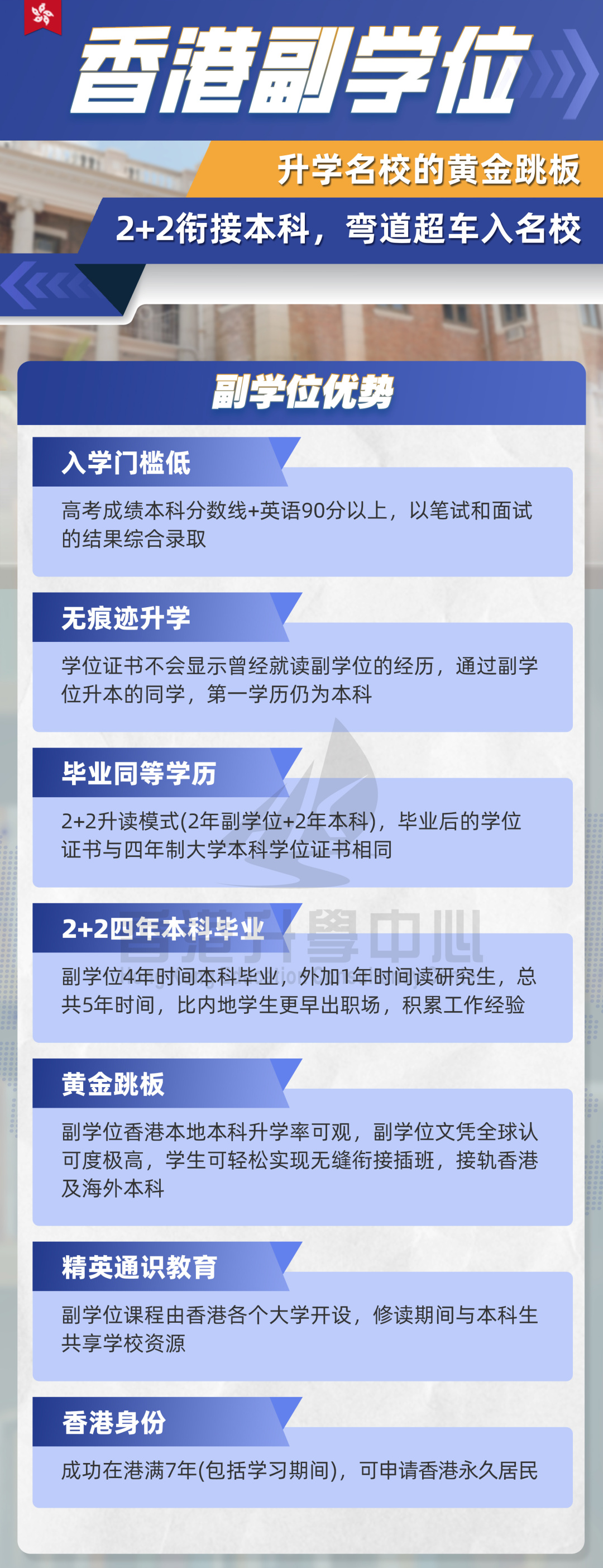 香港副学士是源于美国和加拿大的初级学位,相当于四年制大学的首两年课程,毕业后,可衔接至香港本地及英国、美国、澳洲等国外大学的本科学位课程。毕业后拿到的本科毕业证,与全日制本科同学的毕业证是一模一样的!