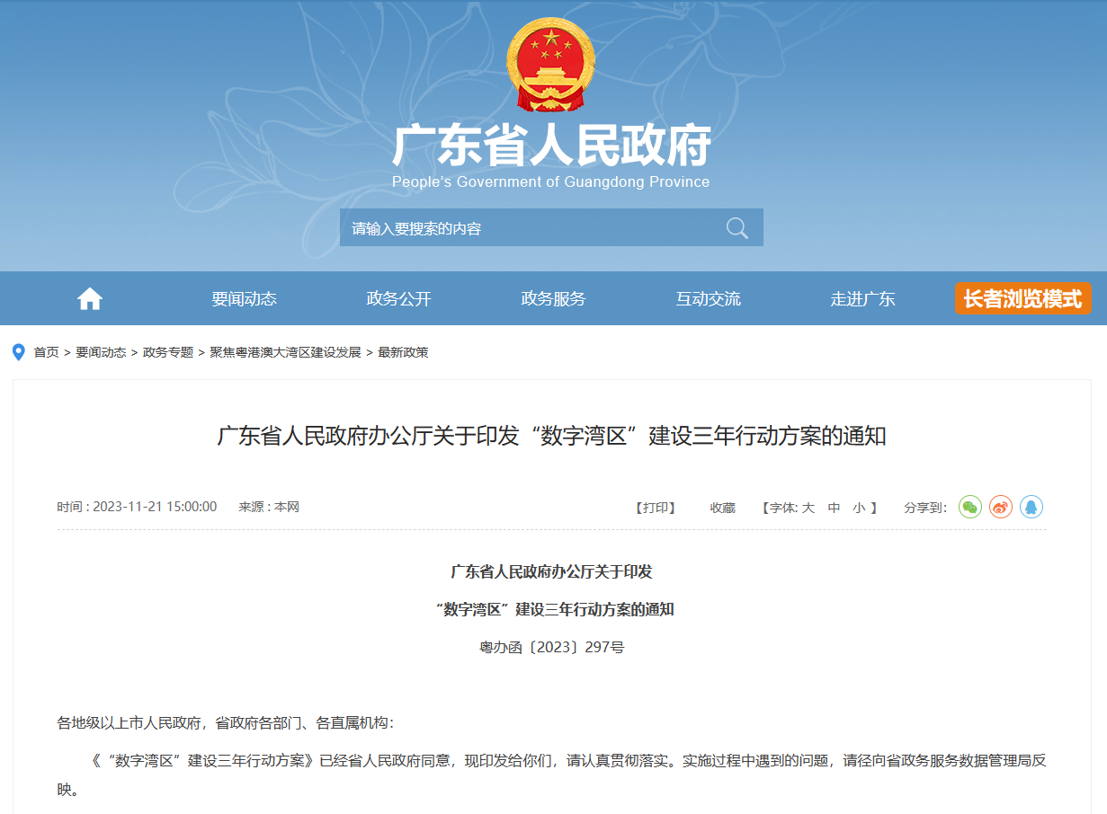 11月21日,广东省政府印发《「数字湾区」建设三年行动方案》,提出推动粤港澳政务服务一体化。