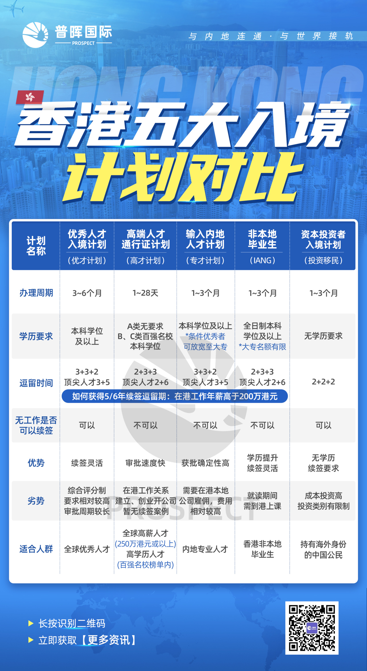 目前,获得香港身份的主流途径有“优才计划”、“专才计划”、“高才计划”与“留学进修”,以及重启的“投资移民”,申请人可根据自身条件及诉求,对号入座选择合适的申请途径。