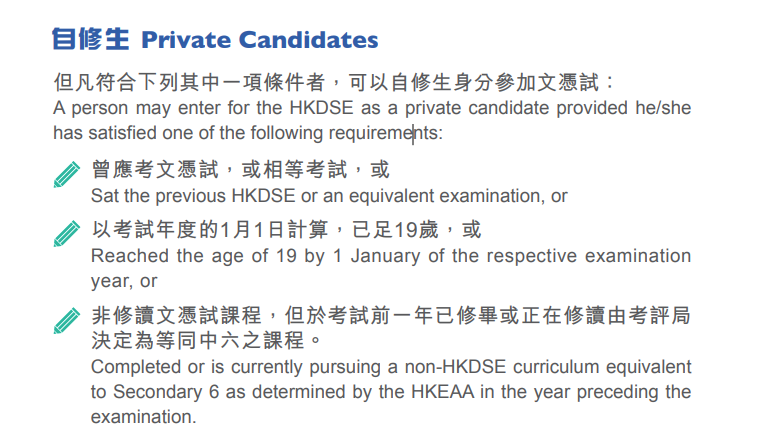 但凡符合以下三项中的任一条件,就可以自修生身份报考该年的香港中学文凭考试。同学要是对高考没有信心,就可以借助DSE来实现心中的名校梦想。
