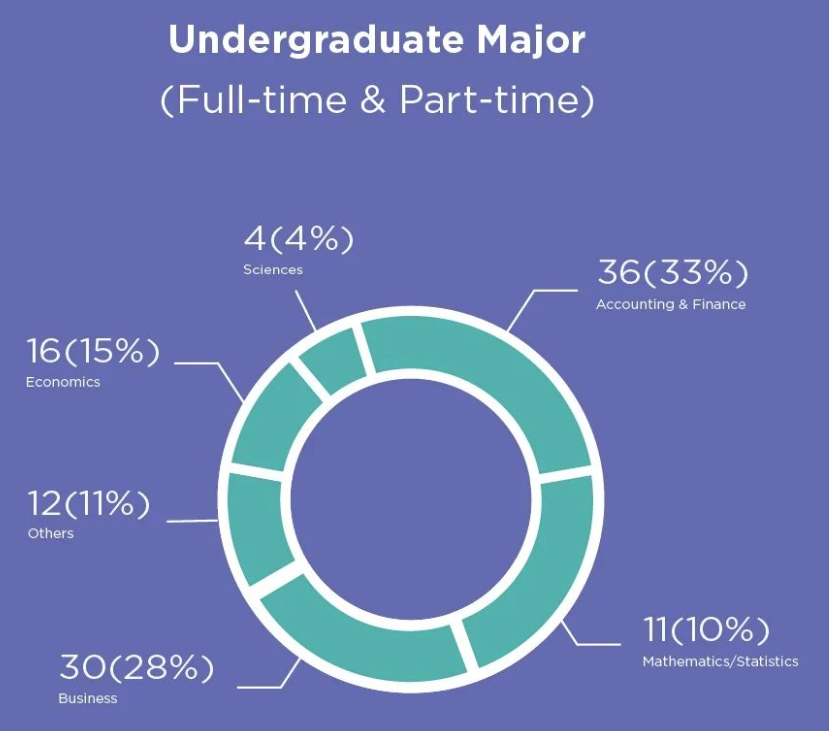 剩下还有约28%的学生是非商科背景,大部分学生是数学、统计学、工程学,以及计算机科学等专业。