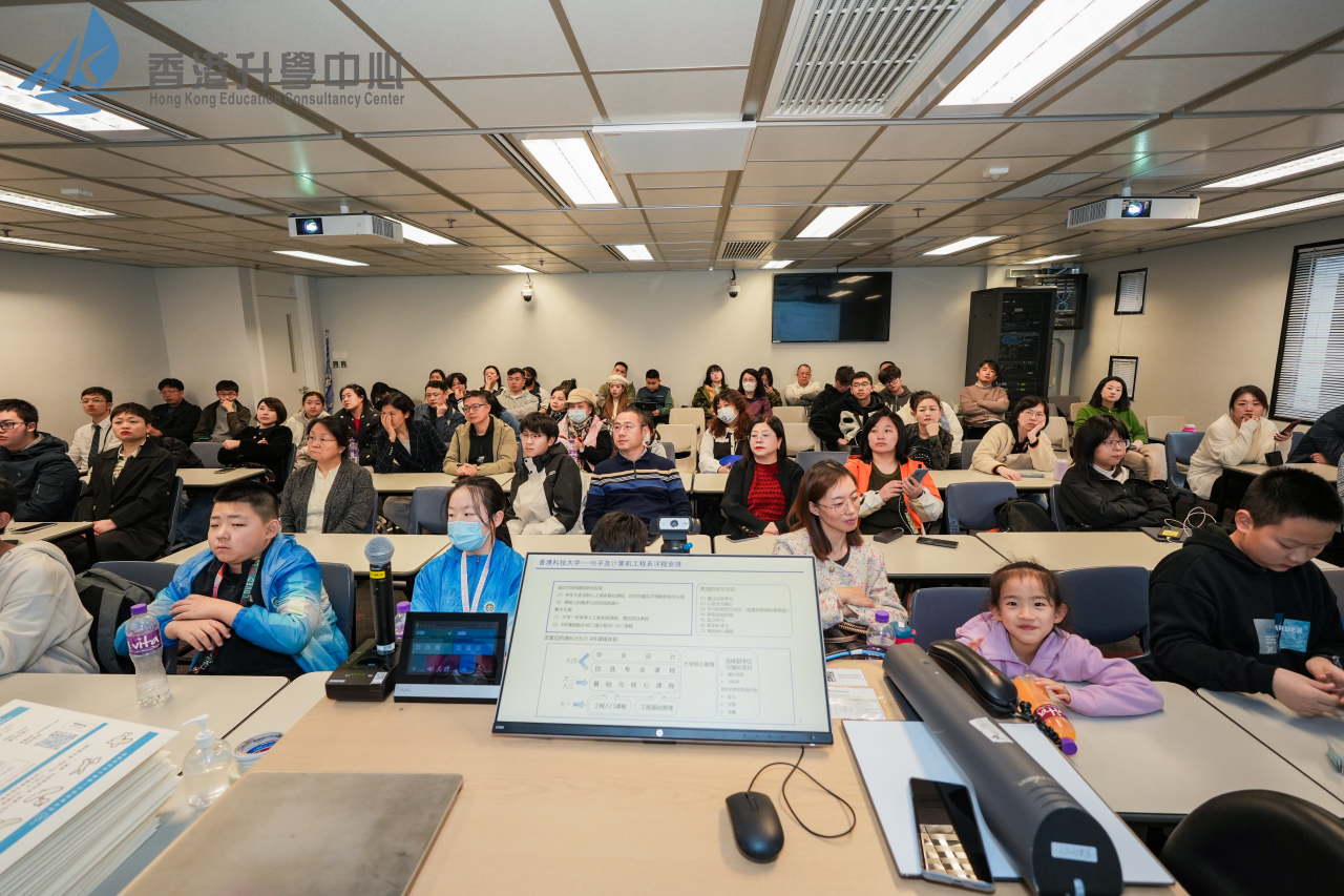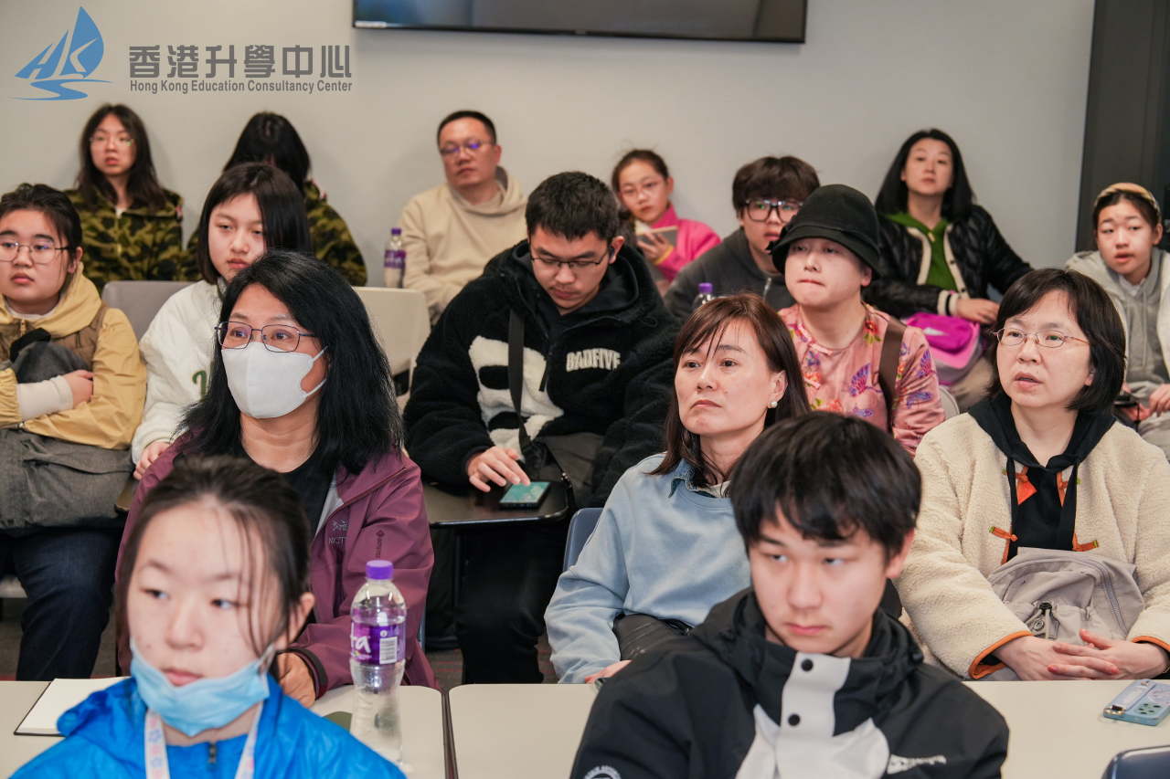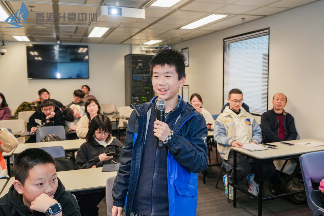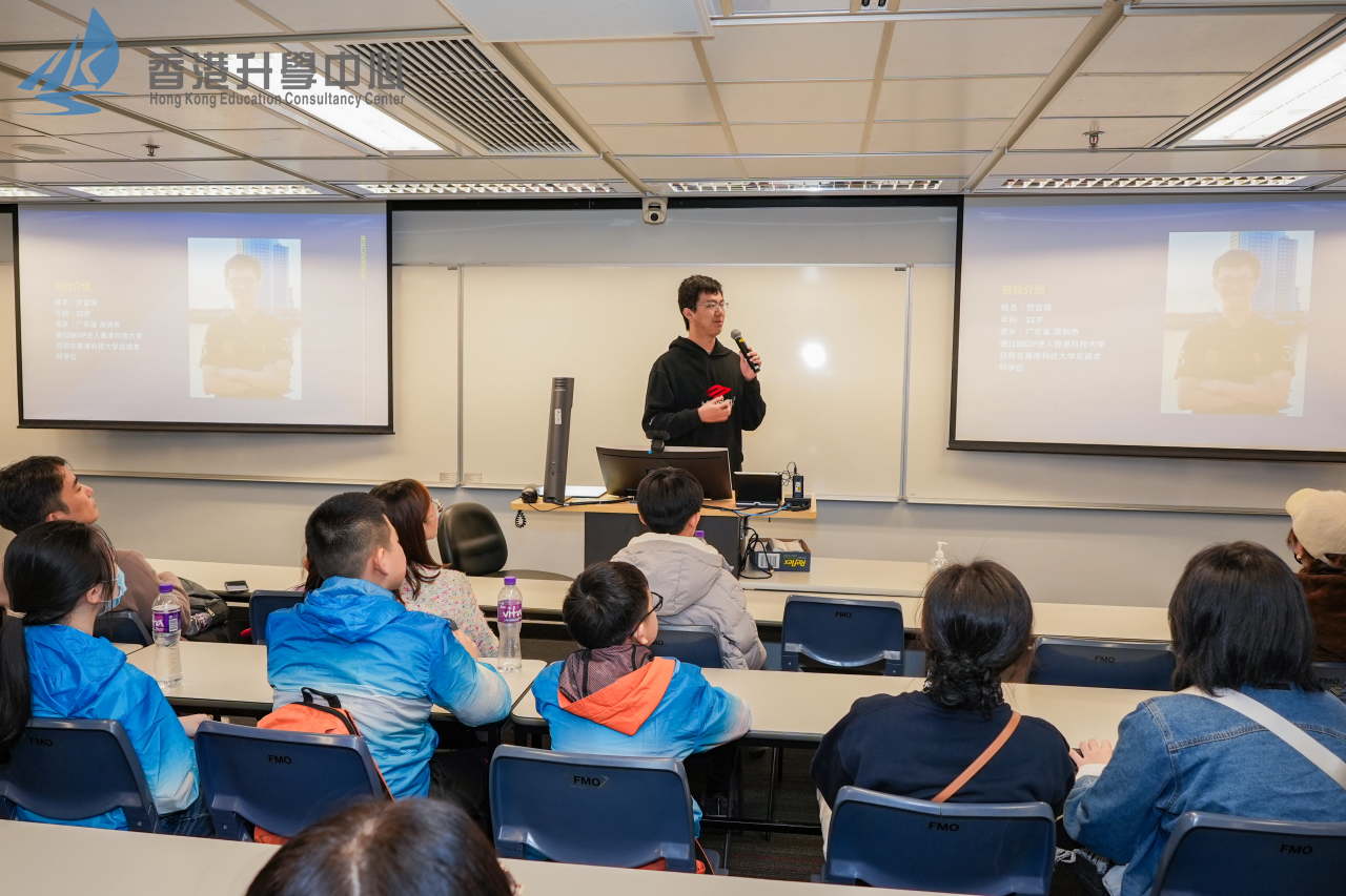 具有内地学习背景、现就读于港科的贺同学作为学生代表发言。他在台上与学弟学妹们分享了他从内地到香港留学以及在港科学习及生活的真实现状,并对现场家长、学员的疑问进行了详细解答,从自身经历帮助大家全面了解港科大。