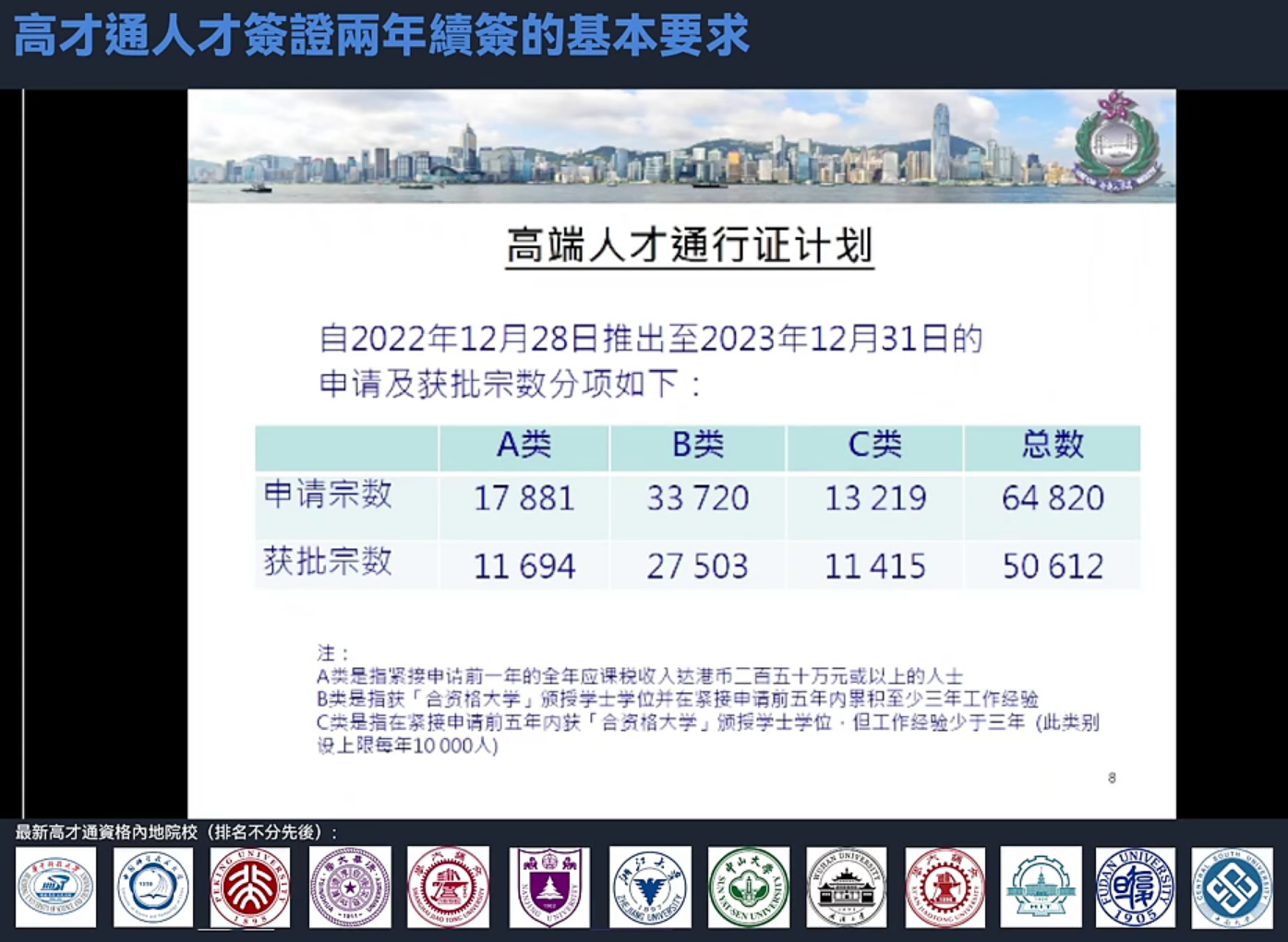 A类的申请要求,是250万港币或以上;至于B类和C类,根据香港入境处最新公布的全球百强名校榜单,全球共有185所院校符合资格。