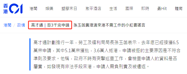 虽然获批量高达5万,但在1月24日的香港立法会议上,香港劳工及福利局局长孙玉菡表示:“高才计划”被拒申请约有3000宗,占总申请数量的5%。