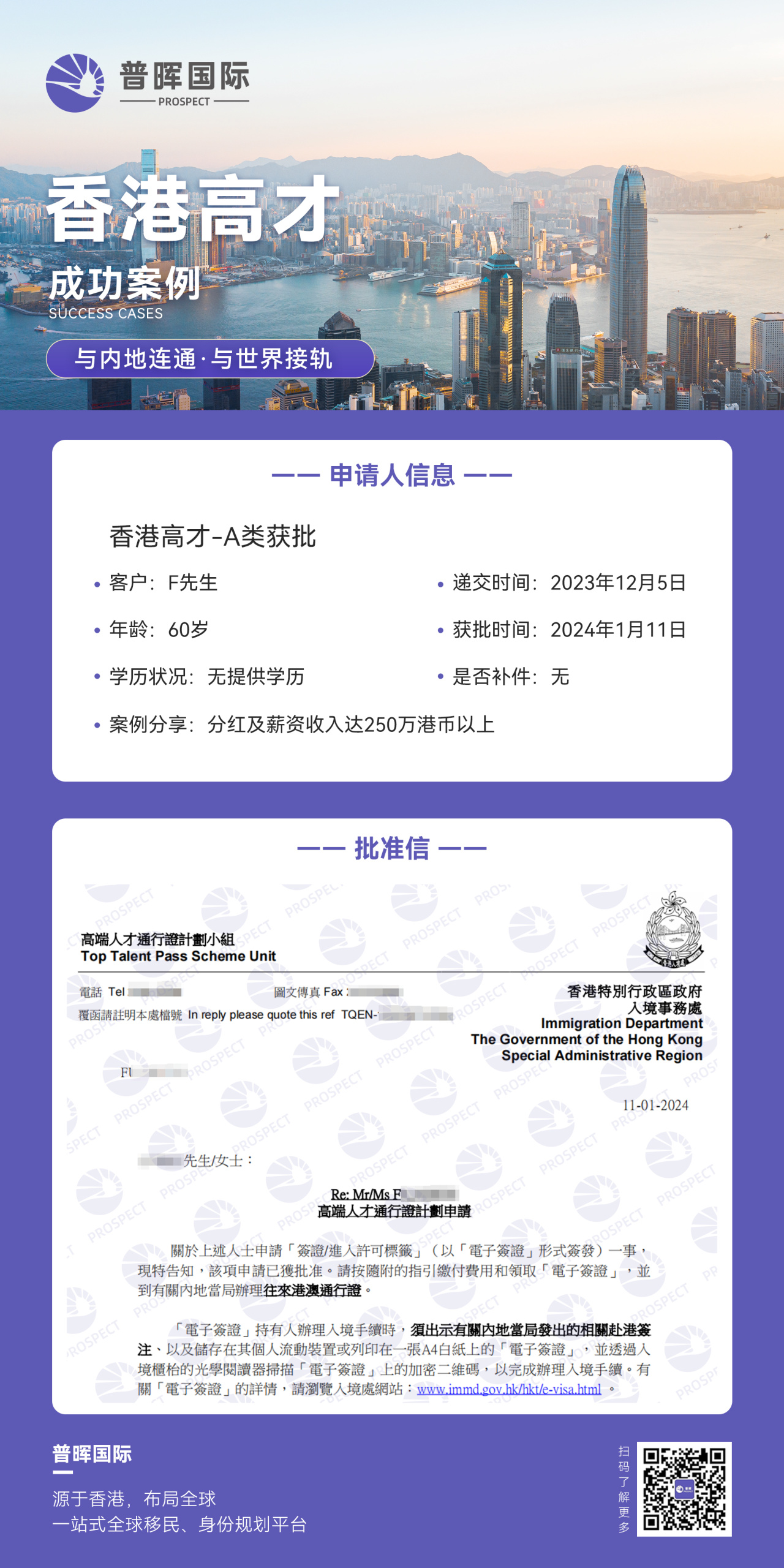 F先生以股东分红及个人薪资收入达250万港币以上的申请条件成功获批