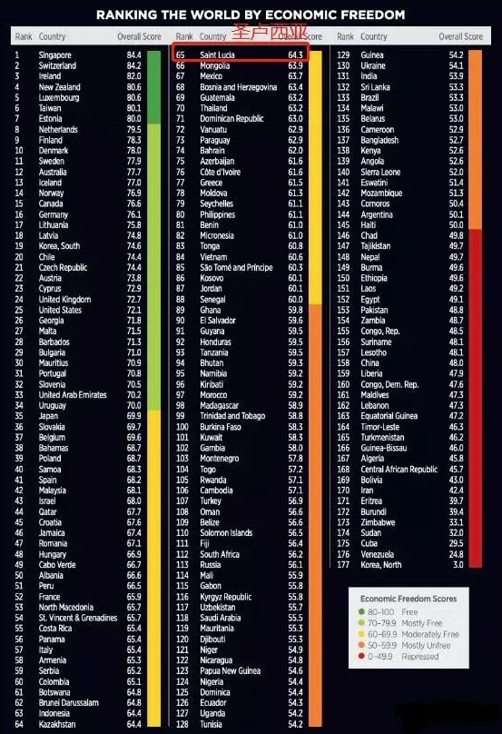 根据2022《世界经济自由指数排名》结果显示,圣卢西亚位列全球第65,加勒比地区第1,紧跟在欧盟国家之后。