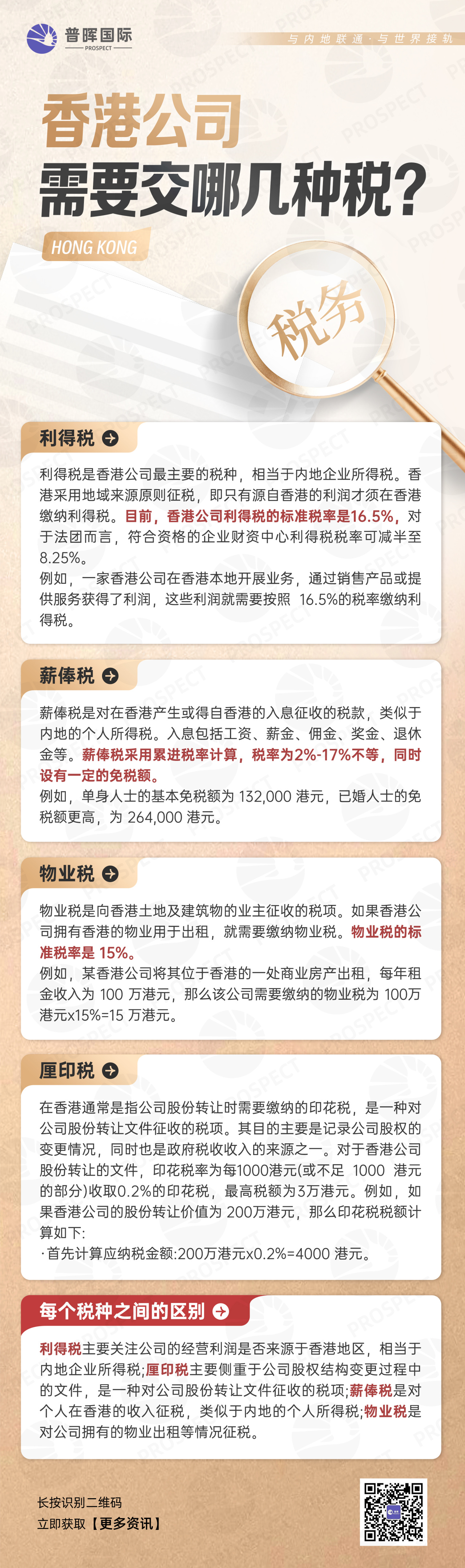 香港的税收制度以简单和低税率为特点,主要直接税包括利得税、薪俸税和物业税。其中,企业需重点关注利得税。