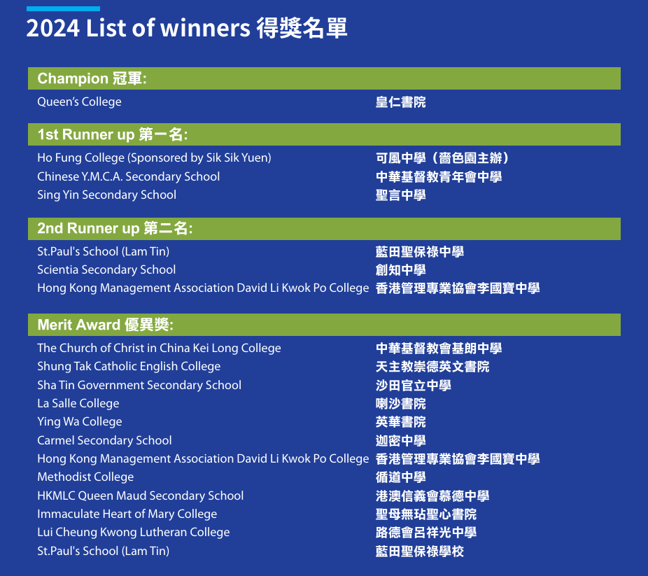 看看2024年的获奖名单,其中不乏很多Band1名校,可以说这个赛项的含金量也不小~不知道这份名单里有没有各位家长和孩子的心仪学校?