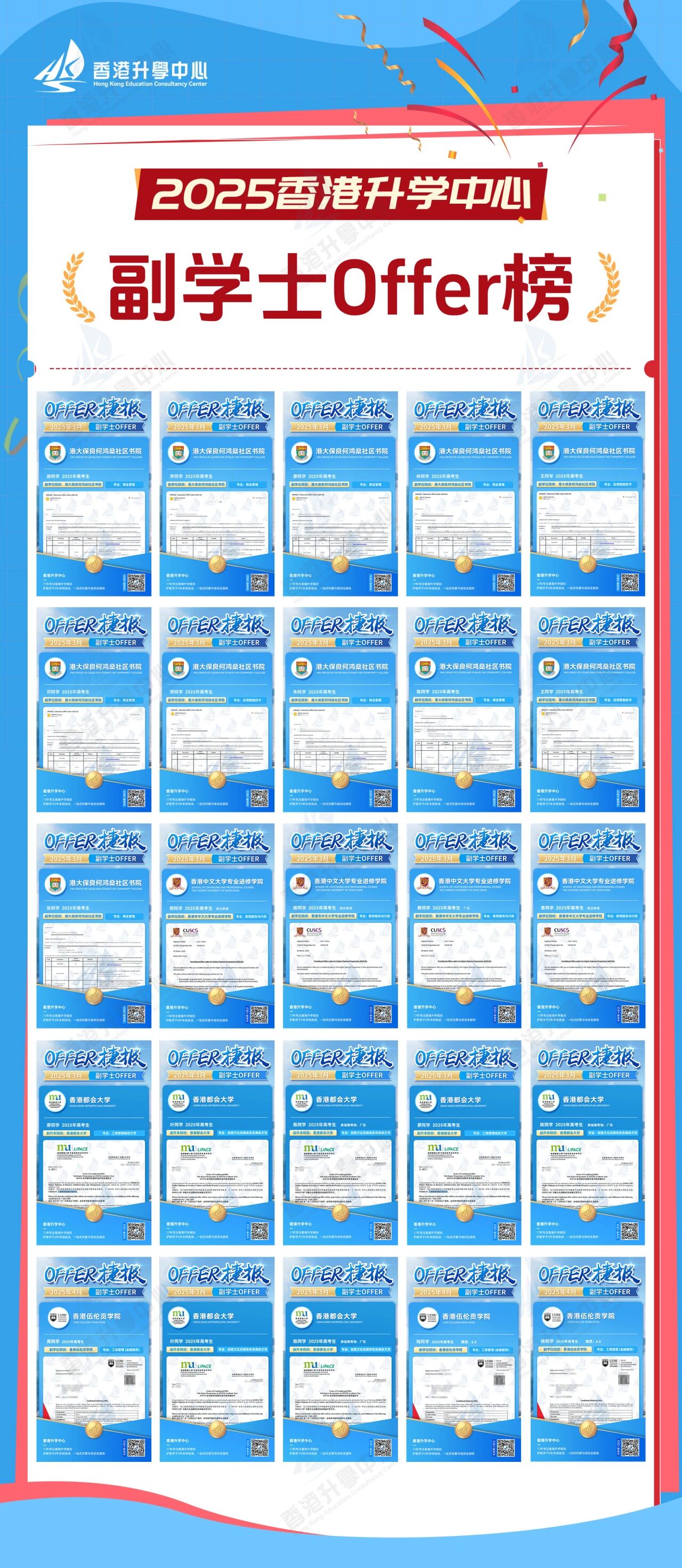 • 香港升学中心是内地首批引入副学士项目的教育机构之一,凭借深厚申请积淀,为学员提供定制择校规划+专属面试特训,全流程一对一跟进,累计助力学员斩获近300封副学士Offer!