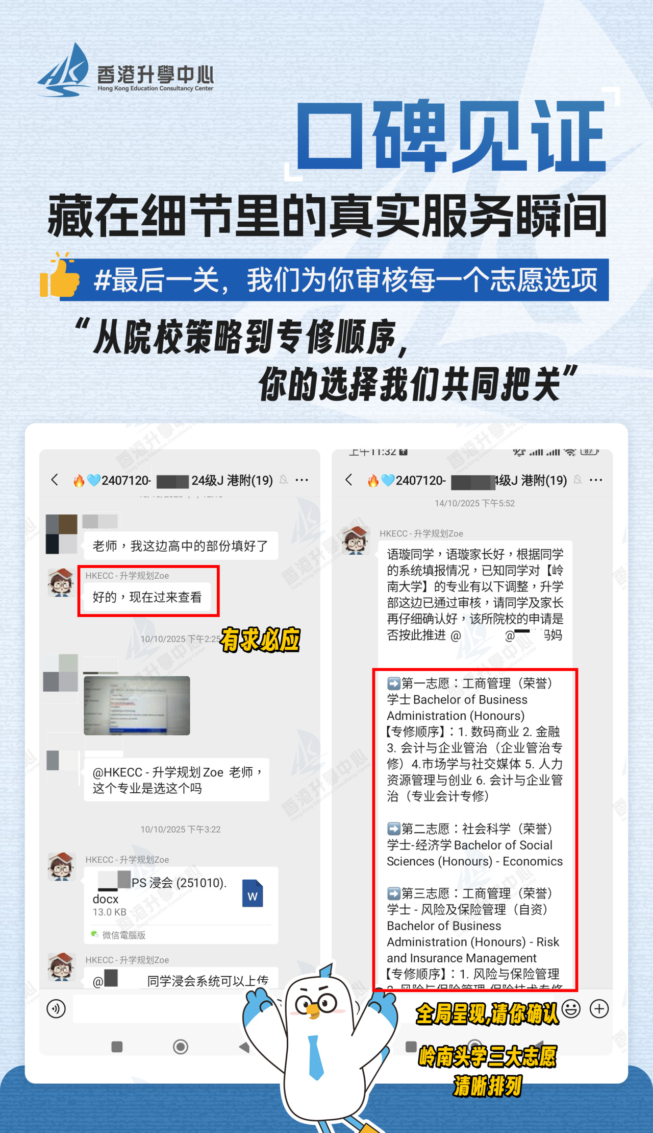 • 建立期末、期中约谈关怀机制,学业导师一对一与学生沟通学习情况,及时发现问题并调整学习计划;生活顾问随时响应学生的生活难题,从租房建议到证件办理,做学生在香港的“贴心后盾”。在期中、期末的关键节点,开展专属约谈关怀,针对性疏解学业压力;考前组织集中答疑,扫清知识盲区,助你始终怀揣从容自信的心态,应对每一场考试。