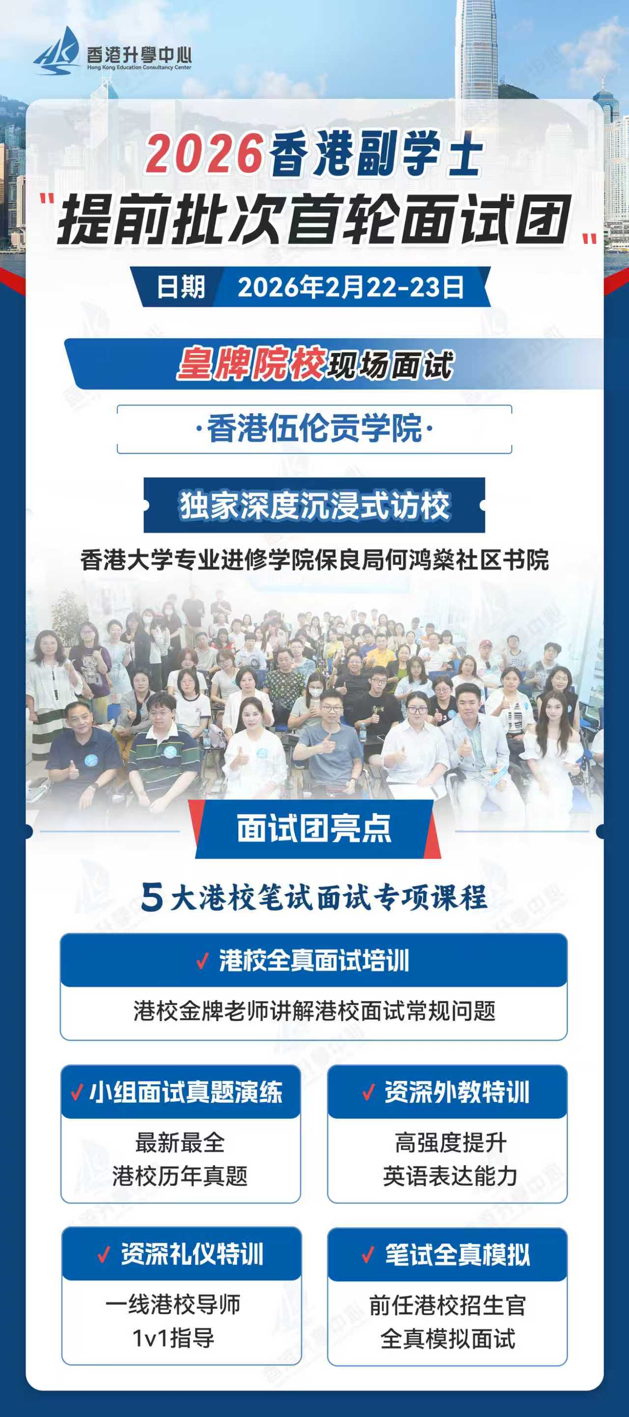 我们将于2026年2月22-23日,组织学生亲赴香港,参与包括香港伍伦贡学院、香港大学专业进修学院保良局何鸿燊社区书院等在内的皇牌院校现场面试,并享受独家深度沉浸式访校体验。