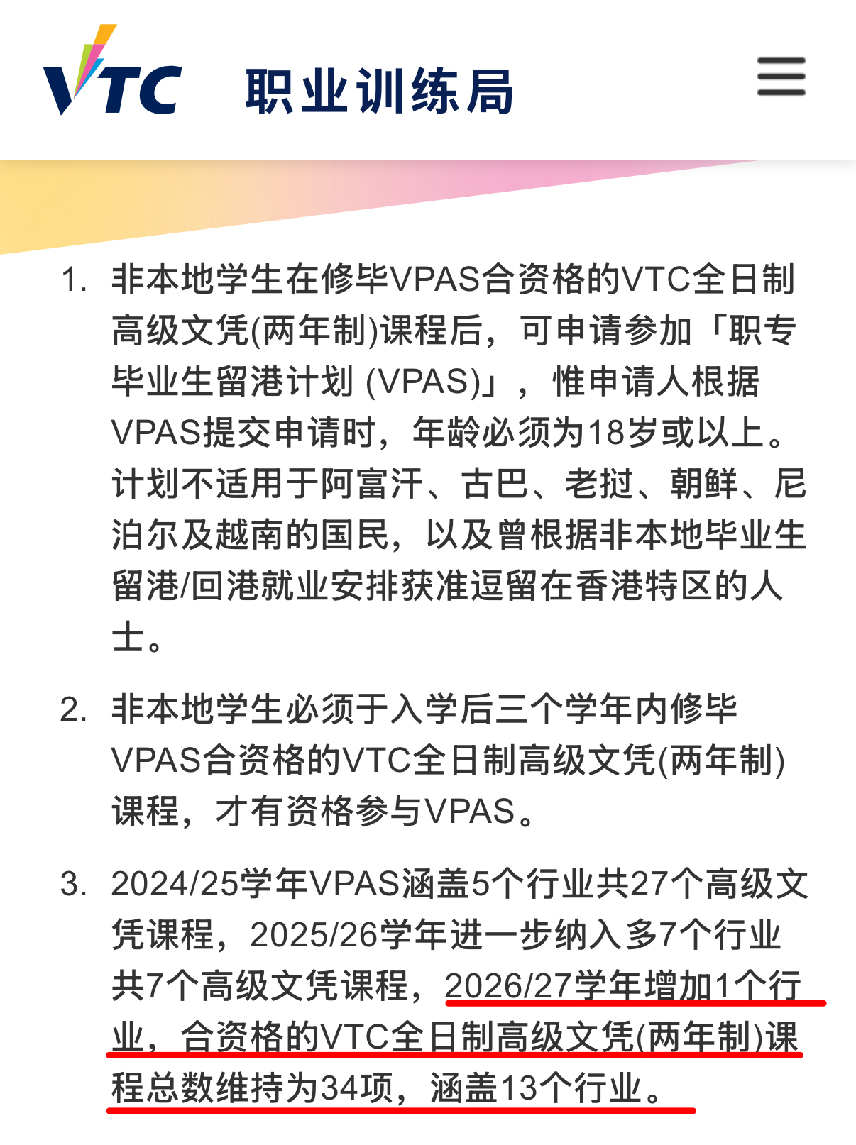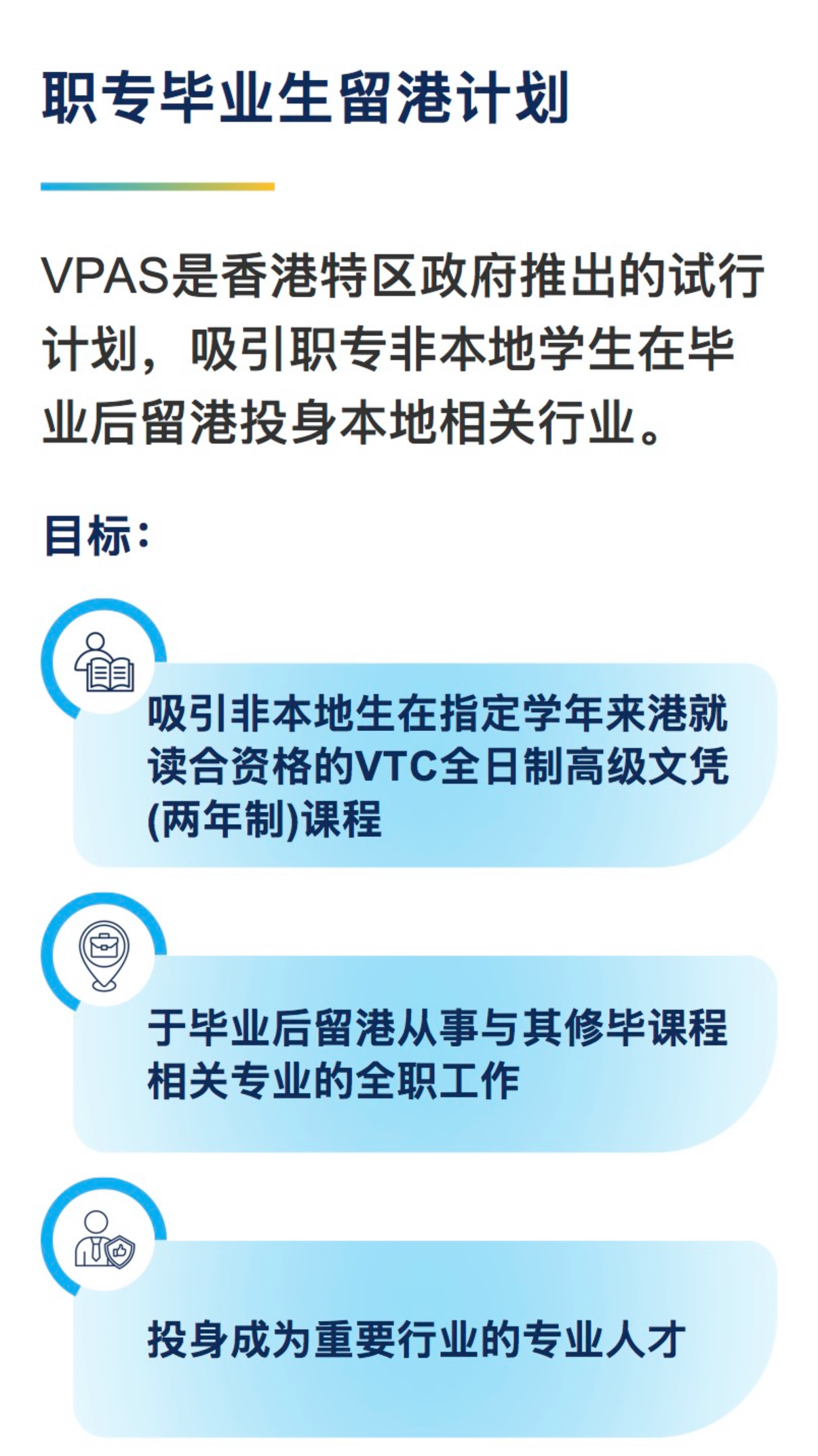 职专毕业生留港计划(VPAS)是香港特区政府推出的试行计划,旨在吸引非本地学生在指定学年来港就读合资格的VTC全日制高级文凭课程,并在毕业后留港投身相关行业工作。