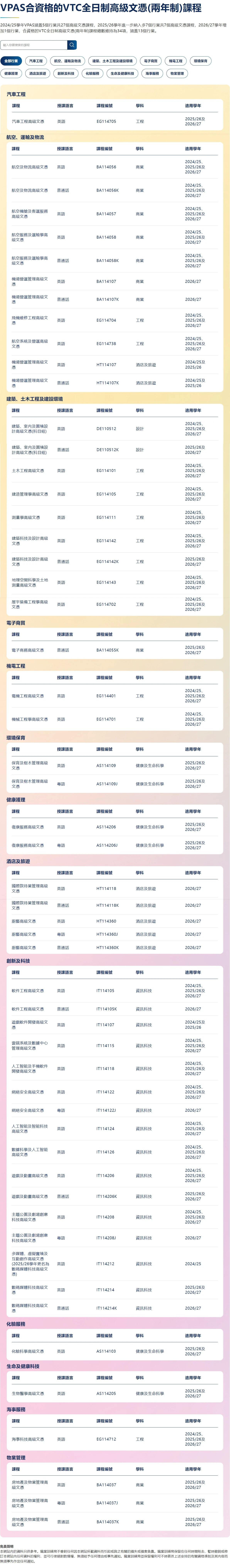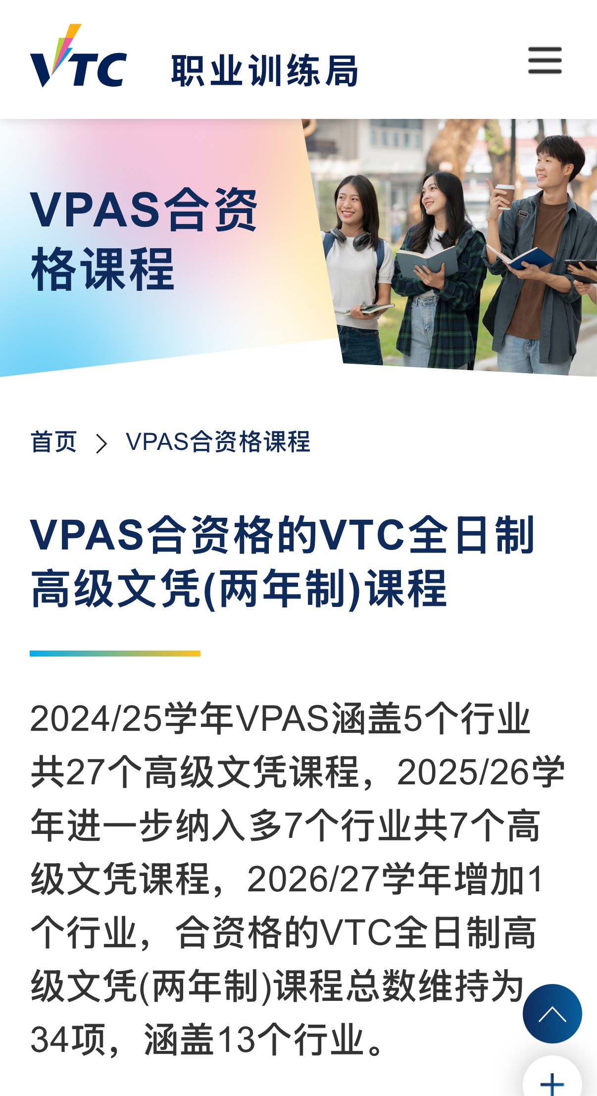 2026/27学年,VPAS将涵盖13个行业,合资格的VTC全日制高级文凭课程数目共34个。