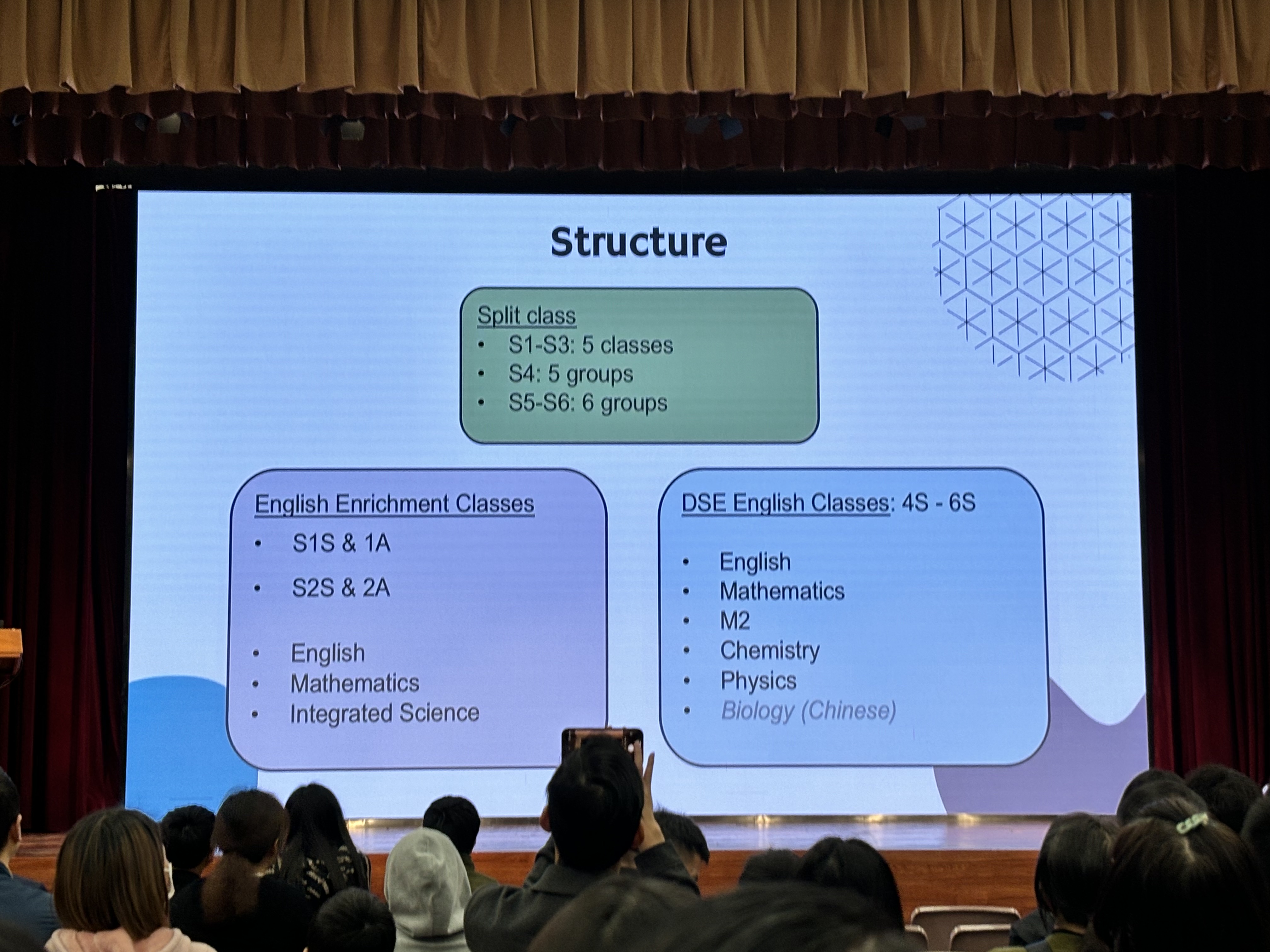 来香港就读,不少家长和学生担忧的第一关都是粤语,而HKECC香港升学中心的顾问老师们在培侨中学的参观过程中发现培侨中学的学生使用粤语和普通话交谈的比例一半一半,粤语为母语的同学会偶尔教说普通话的学生粤语,不少内地学生适应粤语的速度都比较快~来看看HKECC香港升学中心顾问老师在现场实拍的培侨中学教学框架吧!