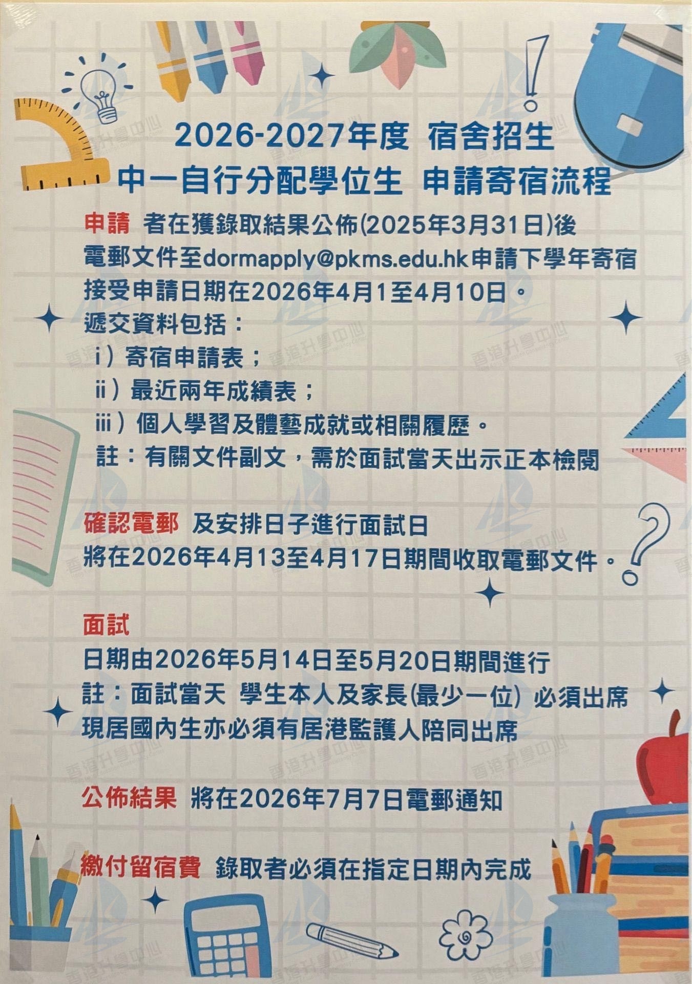 相信不少家长和同学看到这里都对培侨中学的寄宿心动不已啦!那我们要怎样申请呢?根据HKECC香港升学中心的顾问老师在现场实拍的图片来看,家长们可以在获得培侨中学的录取通知后,在2026年4月1日至4月10日递交申请。递交申请之后,孩子们也要准备面试哦,面试时间在2026年5月14日至5月20日进行。面试问题除个人介绍外,基本围绕学习成绩,遵守纪律,服务精神三方面展开,家长们可以参考一下。