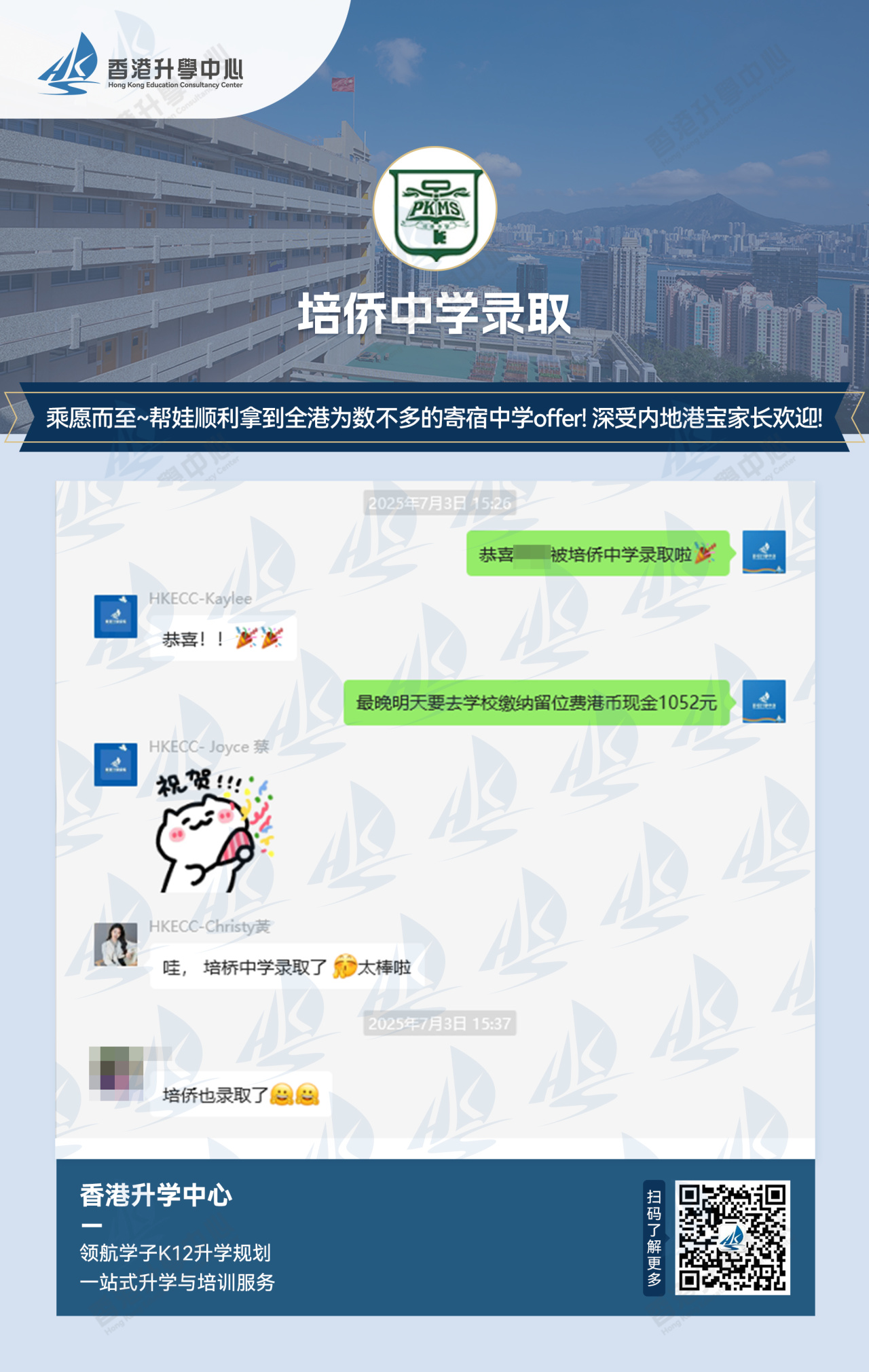如果您正在烦恼如何为孩子找到一所既能让孩子好好学习,又能让孩子快速适应香港学制,还能解决孩子上学通勤时间较长这个问题的学校,不仅仅只有培侨中学能够解决您的问题哦~欢迎带着孩子的情况来后台找我们咨询,孩子择校需要从学术竞争力、通勤住宿、家庭支持和升学目标等多方面综合考虑,HKECC香港升学中心提供一站式香港升学服务,从脱产到寄宿,我们将会为您和孩子提供最合适的方案,让孩子的香港升学旅程更加开心。