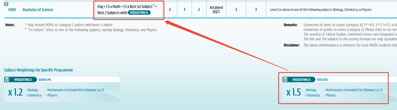 值得一提的是,部分香港的大学院校或课程在录取时,会将乙类应用学习科目视为选修科目、给予额外加分或作为辅助参考。然而,多数学生仍会优先选择甲类科目,因为其认可度更广,在最终计分环节更有利于报考不同专业。接下来,让我们来以香港大学理学士专业来举个例子吧!