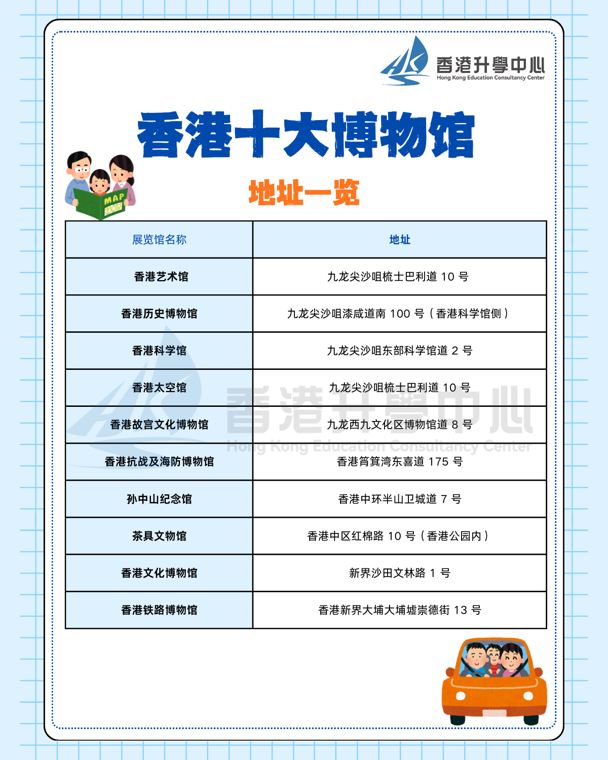 孩子们在参加冬令营期间,每天的课堂结束后,还可以前往香港各大展览馆游玩。为方便您与孩子高效规划亲子行程,HKECC香港升学中心特别整理了香港各大展览馆信息。下表所列场馆,均已按照从我们校区出发的由近及远顺序排列,并附上详细地址。家长们可以收藏保存,届时和孩子一同前往,亲子乐,就是这么简单~