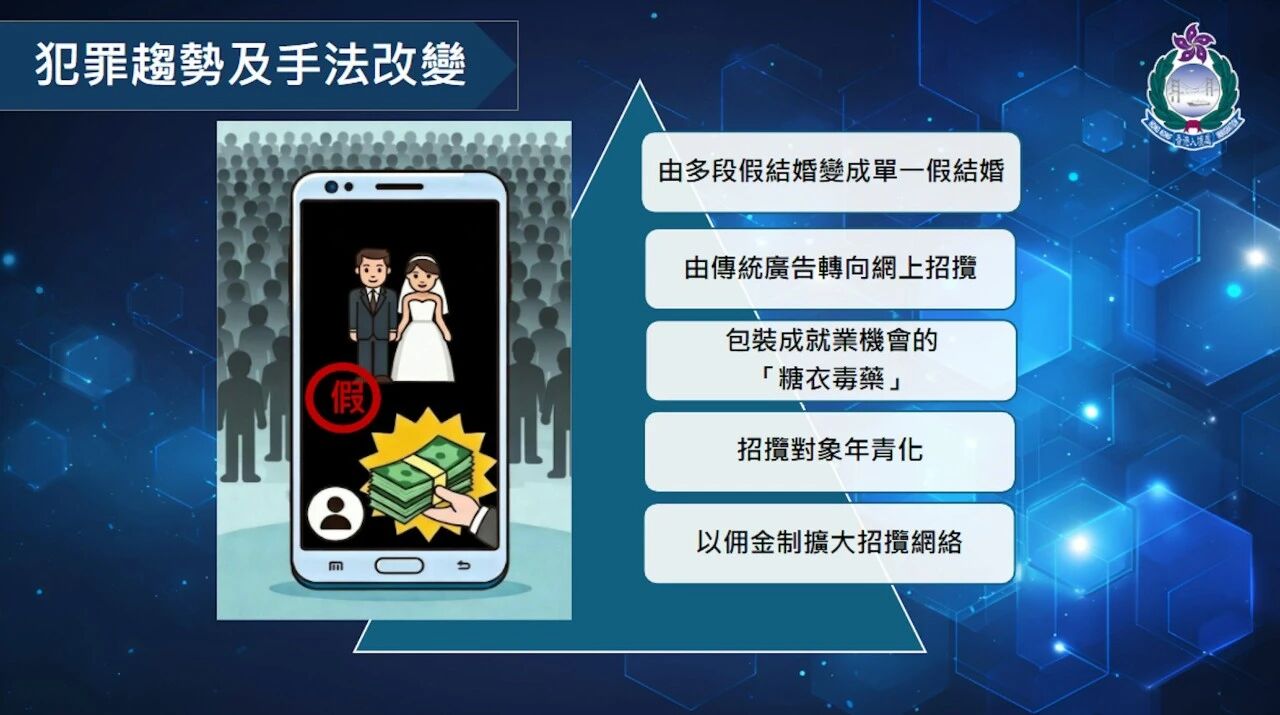 此次香港入境处与广东省公安厅联合展开“闪刺2025”专项行动,成功瓦解该犯罪集团,共拘捕47人。调查显示,该团伙在两年内安排了超过60宗假结婚,涉案金额高达750万港元。令人震惊的是,集团主脑及骨干成员竟也亲自参与假结婚,以身试法,最终一同落网。