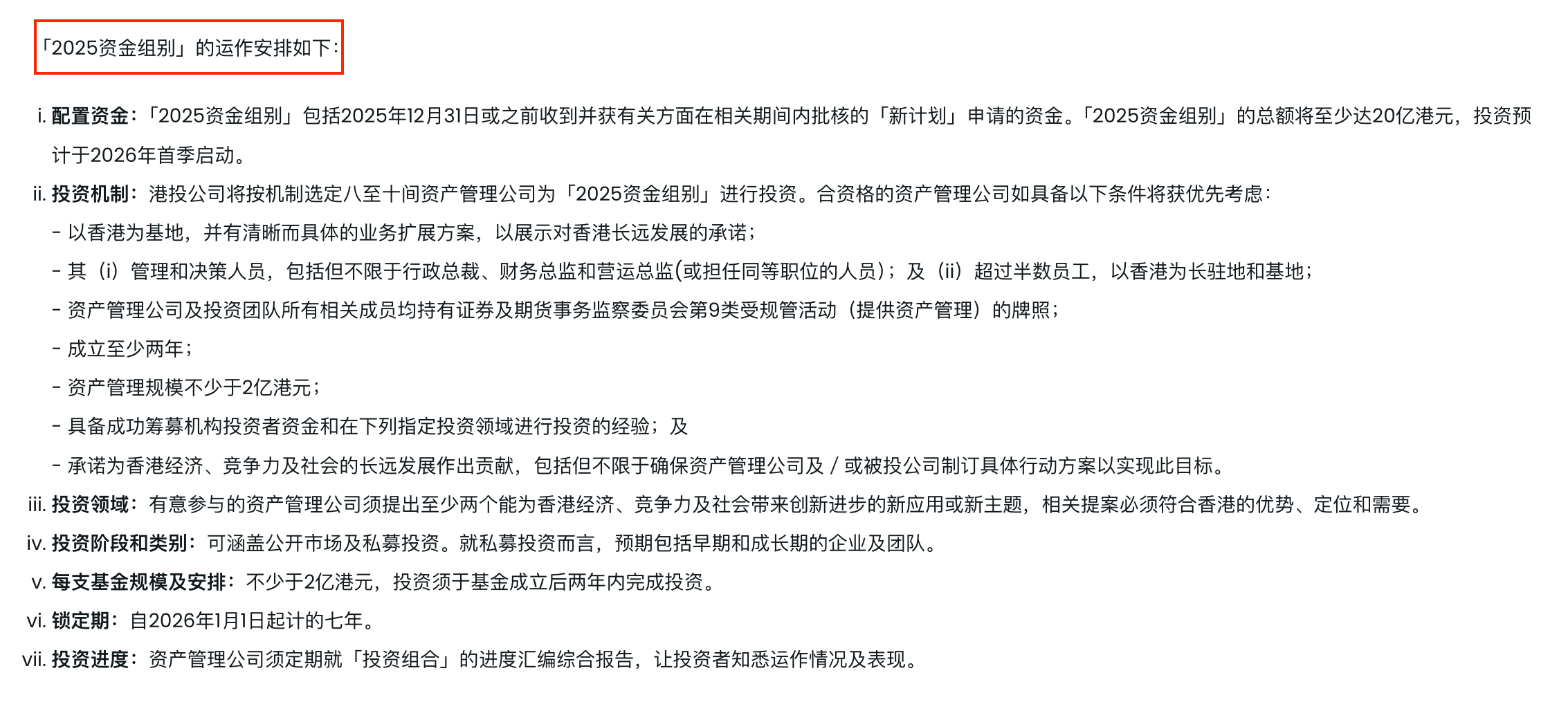2025资金组别截至2025年底规模至少达30亿港元,资金将平均分配予上述10家资产管理公司。
