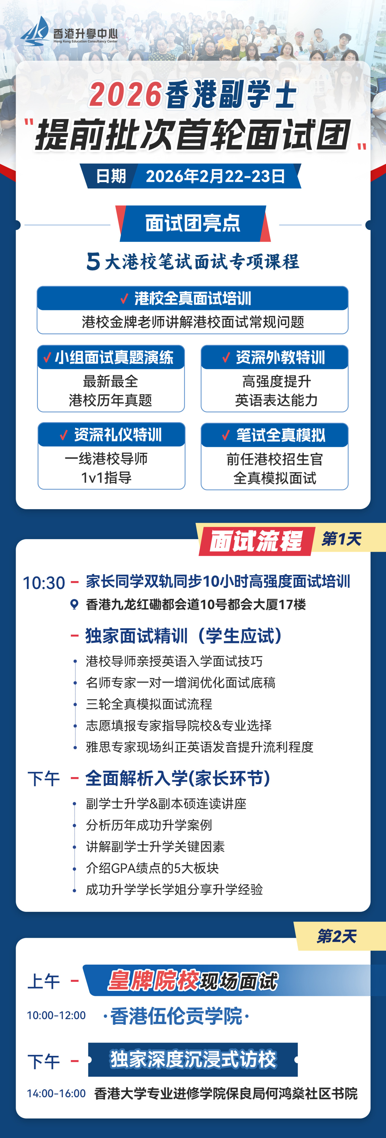 · 现场院校面试:第二天直接进入香港伍伦贡学院面试现场,实现“训练-实战”无缝衔接。