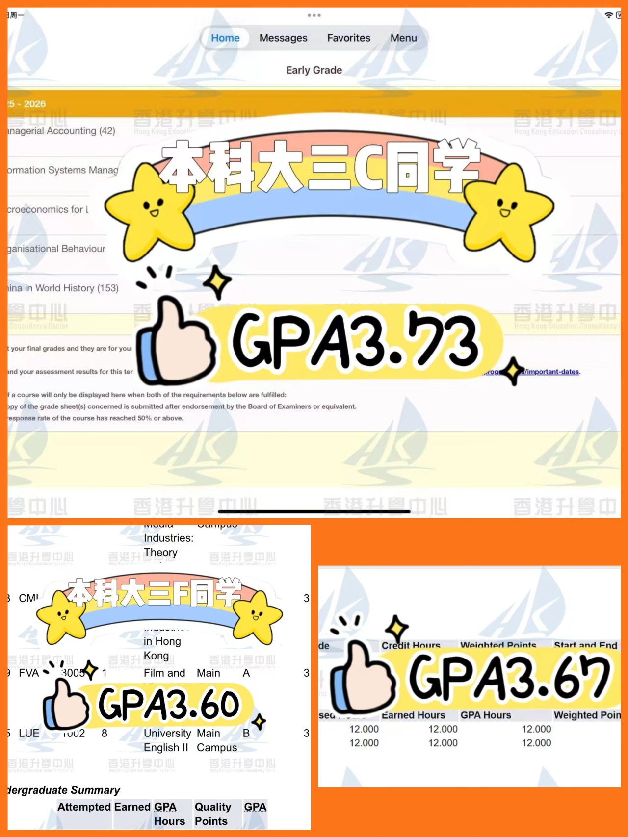 之后,在中心老师的陪伴与帮助下,我们的学生逐渐融入香港高校的学习生活,并以不懈奋斗赢得高分GPA,朝着入读香港八大院校的目标稳步前行。