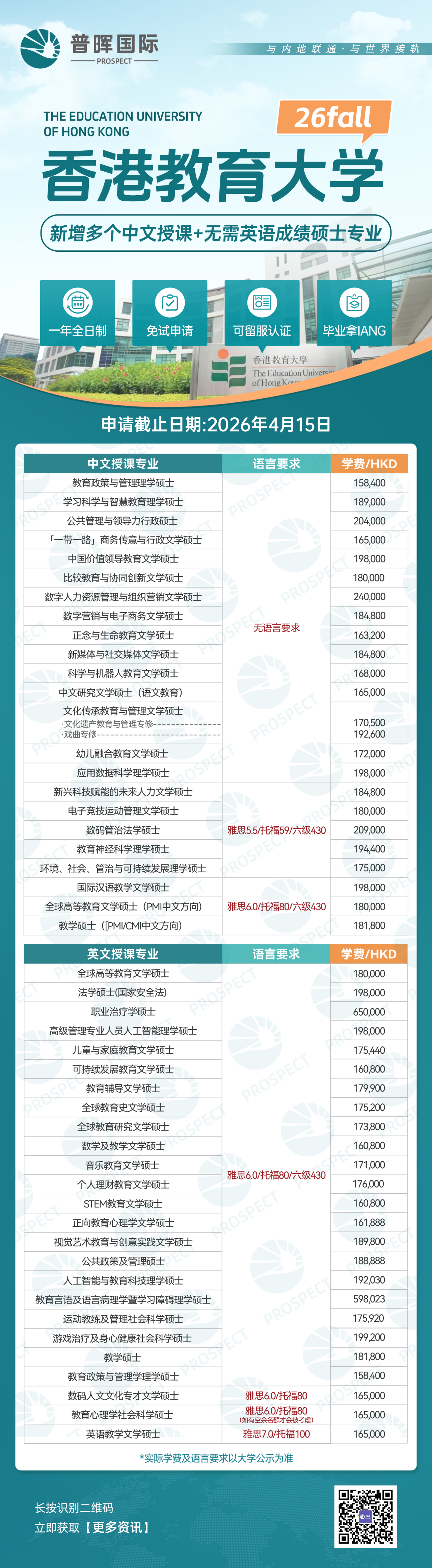 重磅喜讯!原定于3月16日截止的香港教育大学(EdUHK)授课型硕士申请,官方紧急官宣:统一延期至2026年4月15日!
