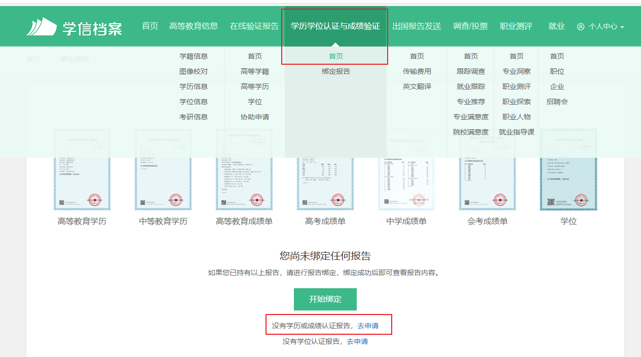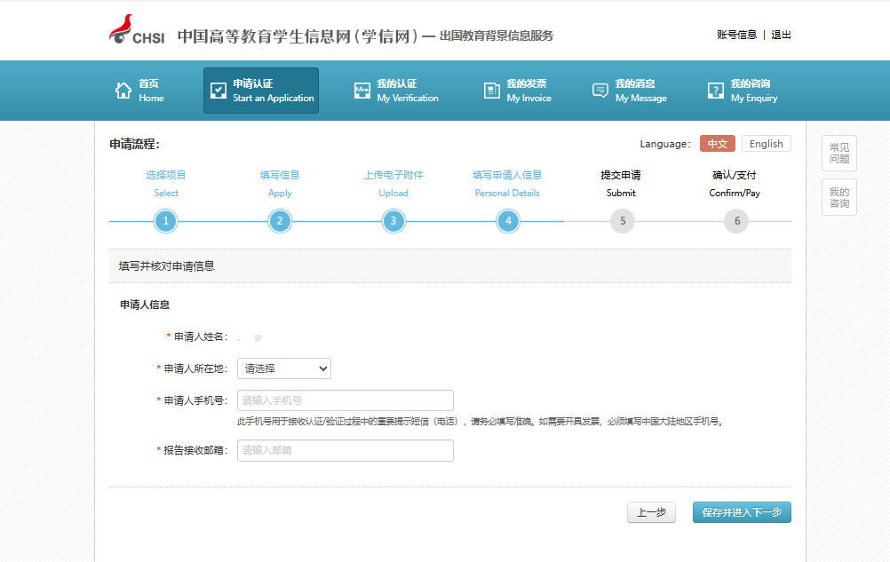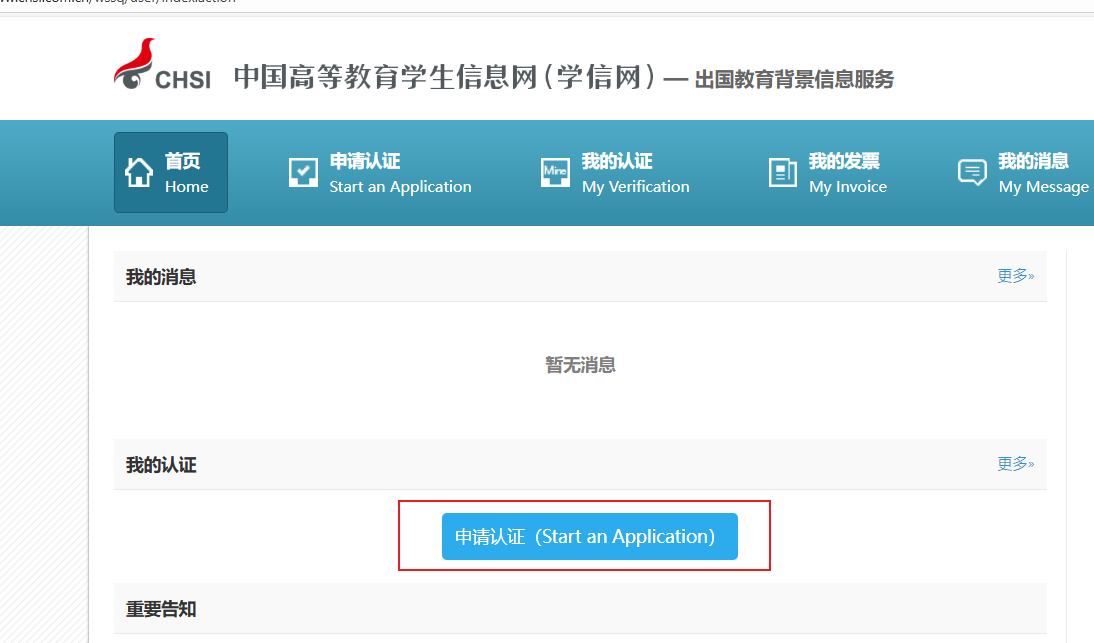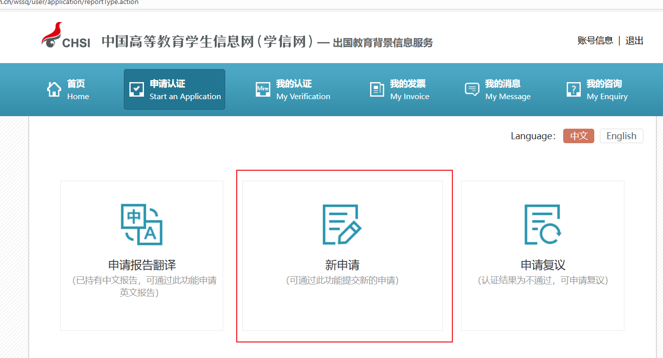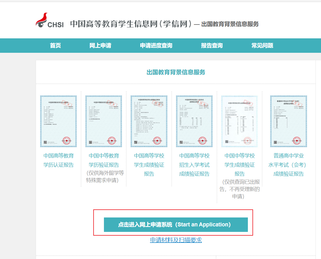 进入“出国教育背景信息服务” → “网上申请系统”,注册/登录账号。