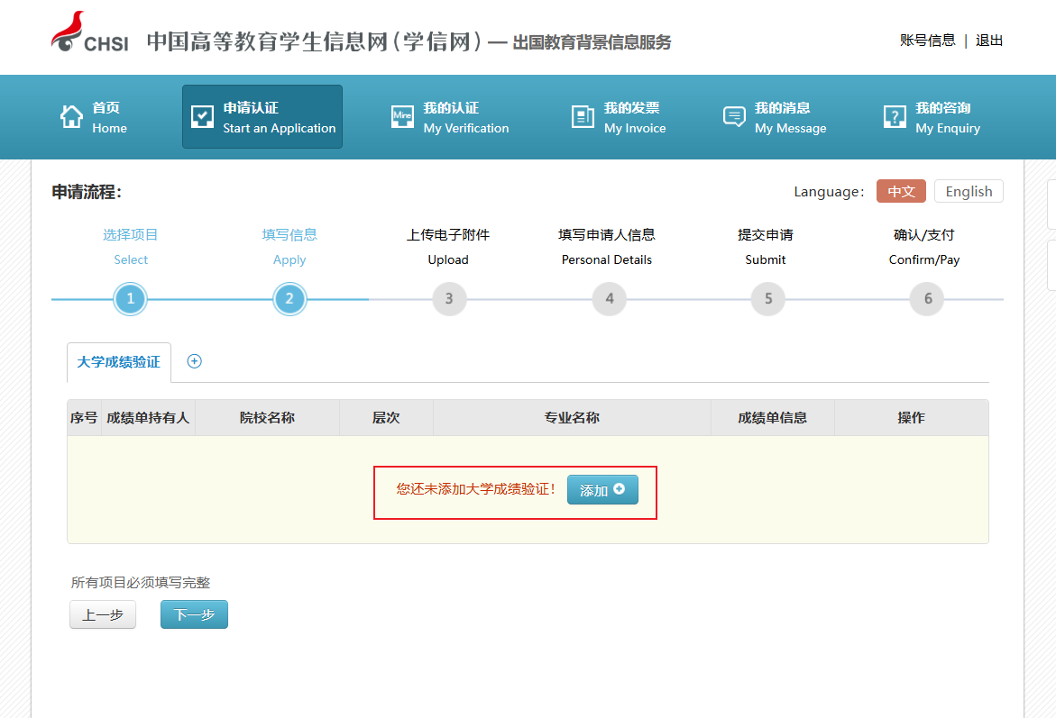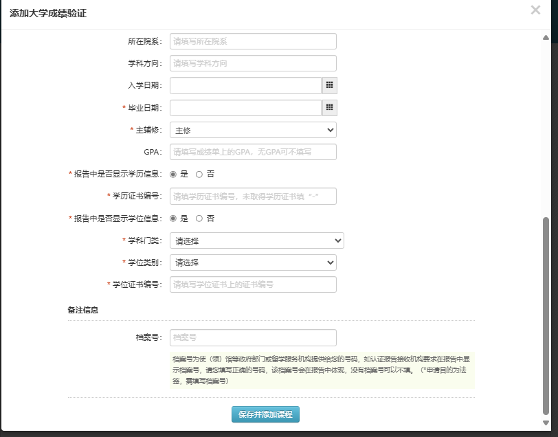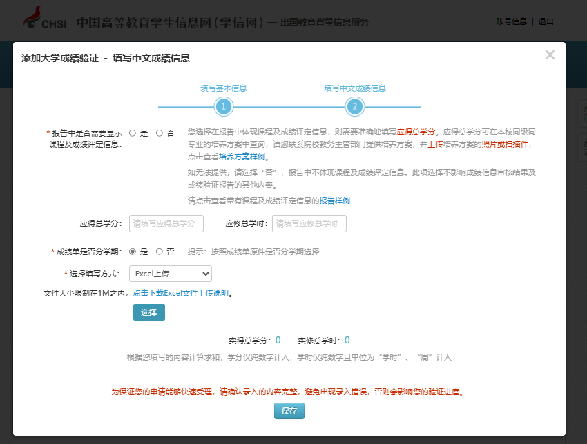 系统自动生成英文成绩模板,补全英文课程名称与分数后上传。英文成绩单出具机构:一般选择“毕业院校或教育考试院”。