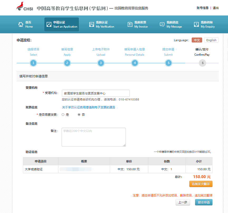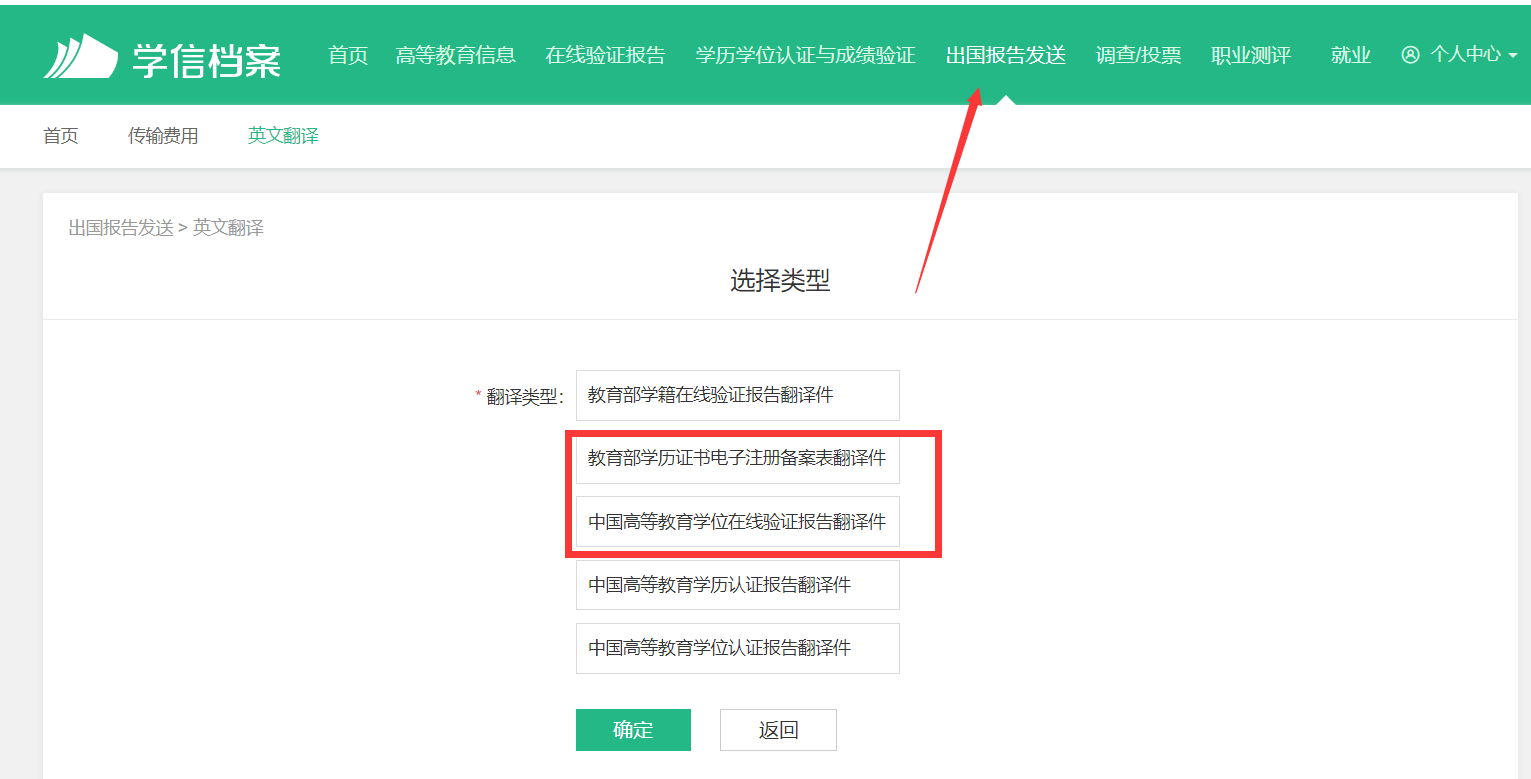 分别选择【教育部学历证书电子注册备案表翻译件】和【中国高等教育学位在线验证报告翻译件】。