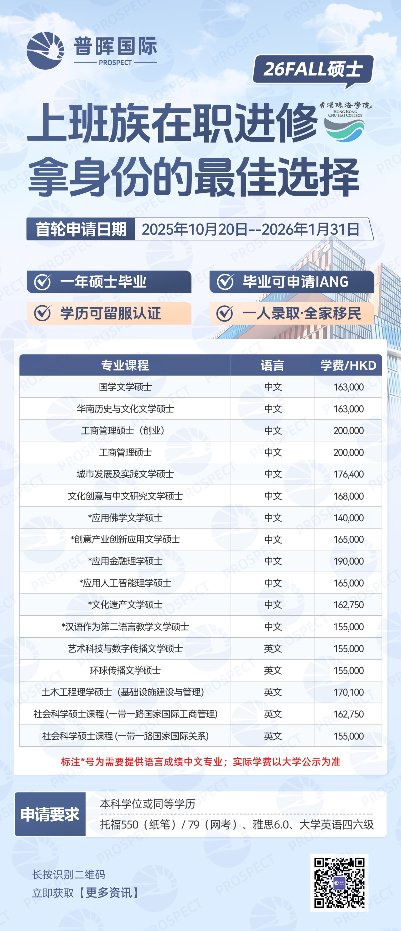 香港珠海学院2026年秋季入学硕士课程已于今天10月20日开放申请!