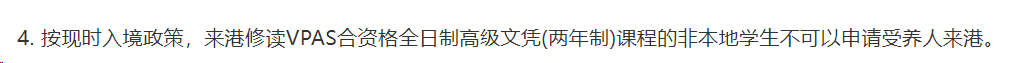 “按现时入境政策,来港修读VPAS合资格全日制高级文凭(两年制)课程的非本地学生不可以申请受养人来港。”