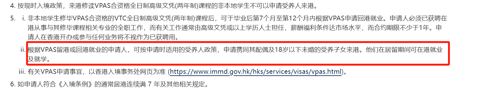 · 不变部分:毕业生通过VPAS计划留港或回港就业后,仍可按当时政策为家人申请受养人签证。