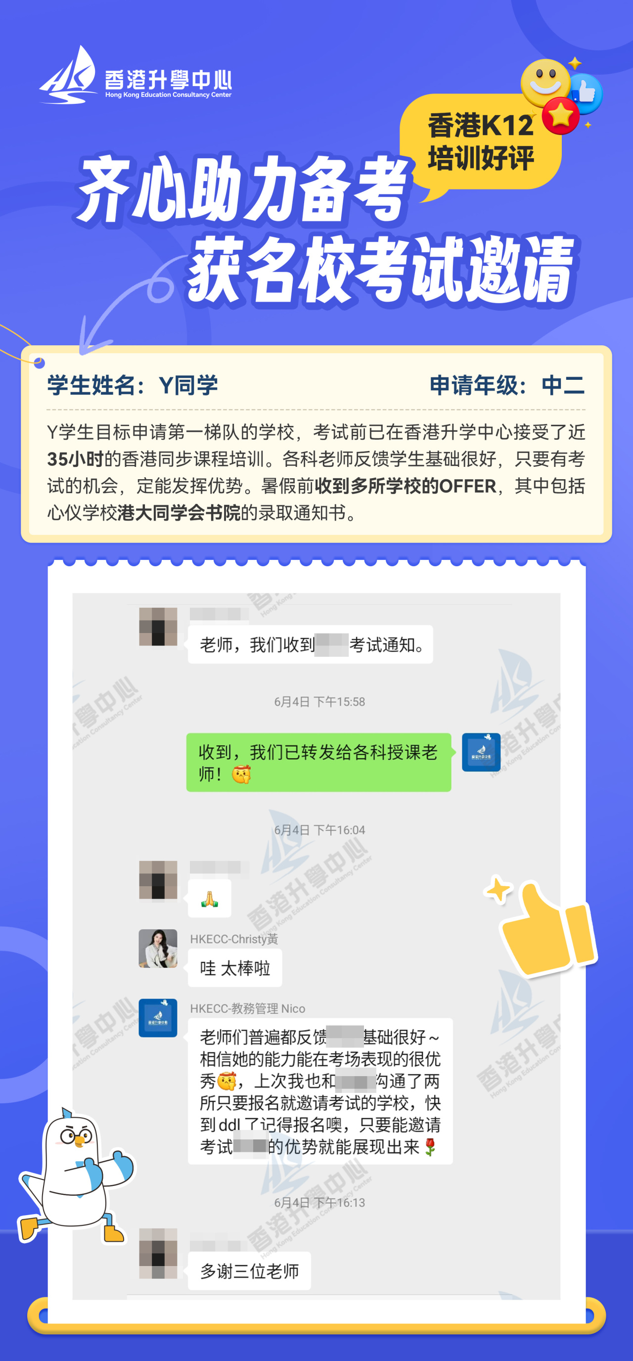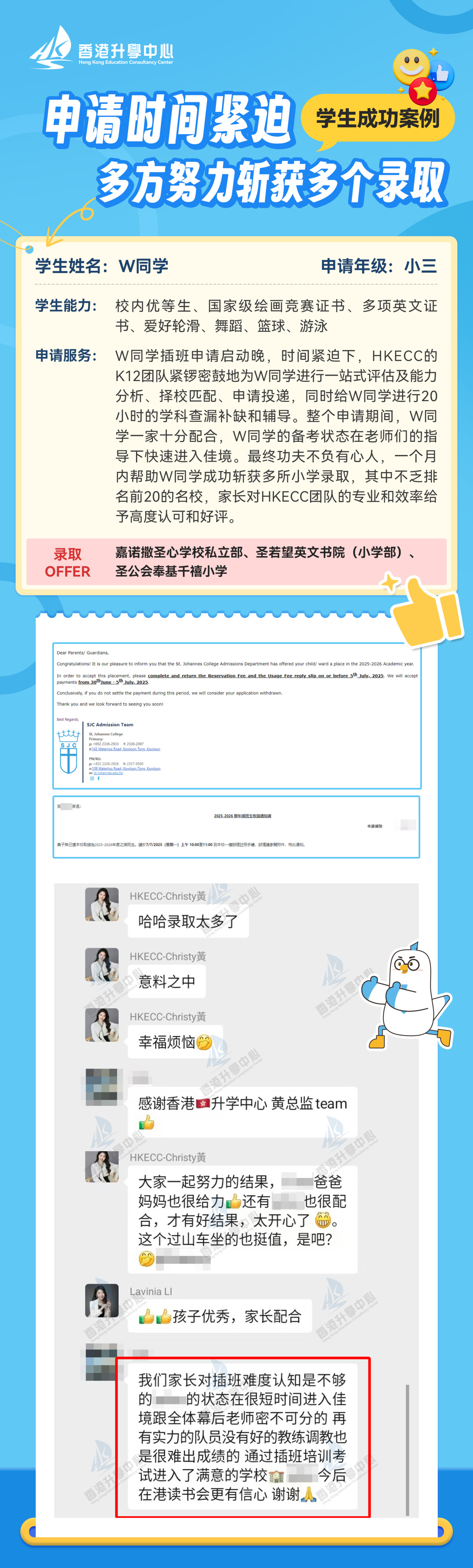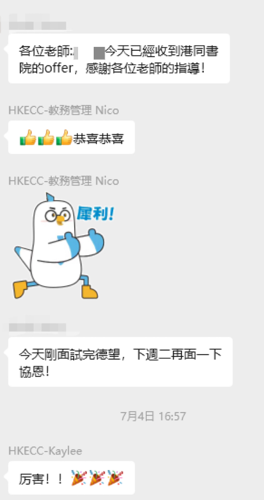 基于我们专业的服务和培训体系,过去的一年,我们学生的升学/插班成功率达到99%,年度名校录取率达到70%。截至目前,我们的学生已成功获得多所香港名校的录取,Offer墙仅展示部分。